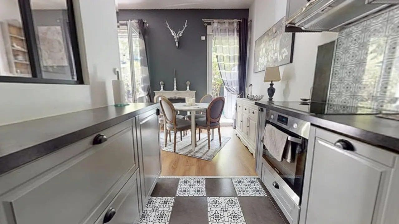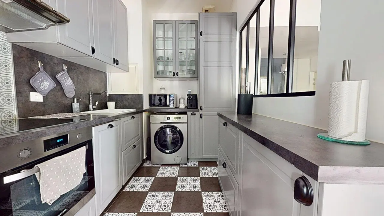 La cuisine semi-ouverte, séparée par une verrière, allie praticité et esthétique. Elle dispose de nombreux rangements et des équipements visibles tels qu’un four encastré, des plaques de cuisson, une hotte, un micro-ondes, un lave-linge et une machine à café.