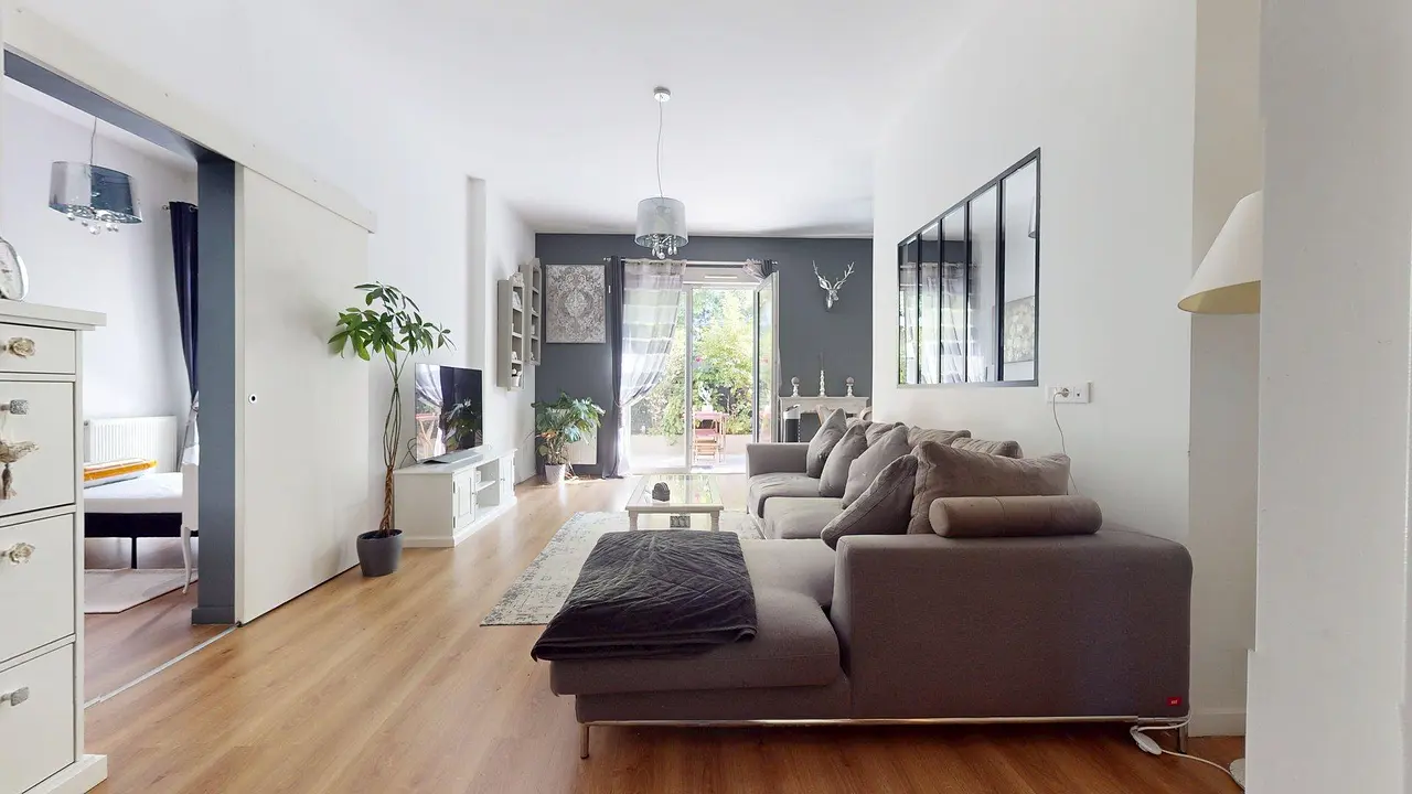 Une terrasse végétalisée borde le séjour et constitue un véritable prolongement de l’espace de vie. Aménagée avec des assises confortables et une table de jardin, elle permet de profiter d’un cadre extérieur intimiste et agréable.