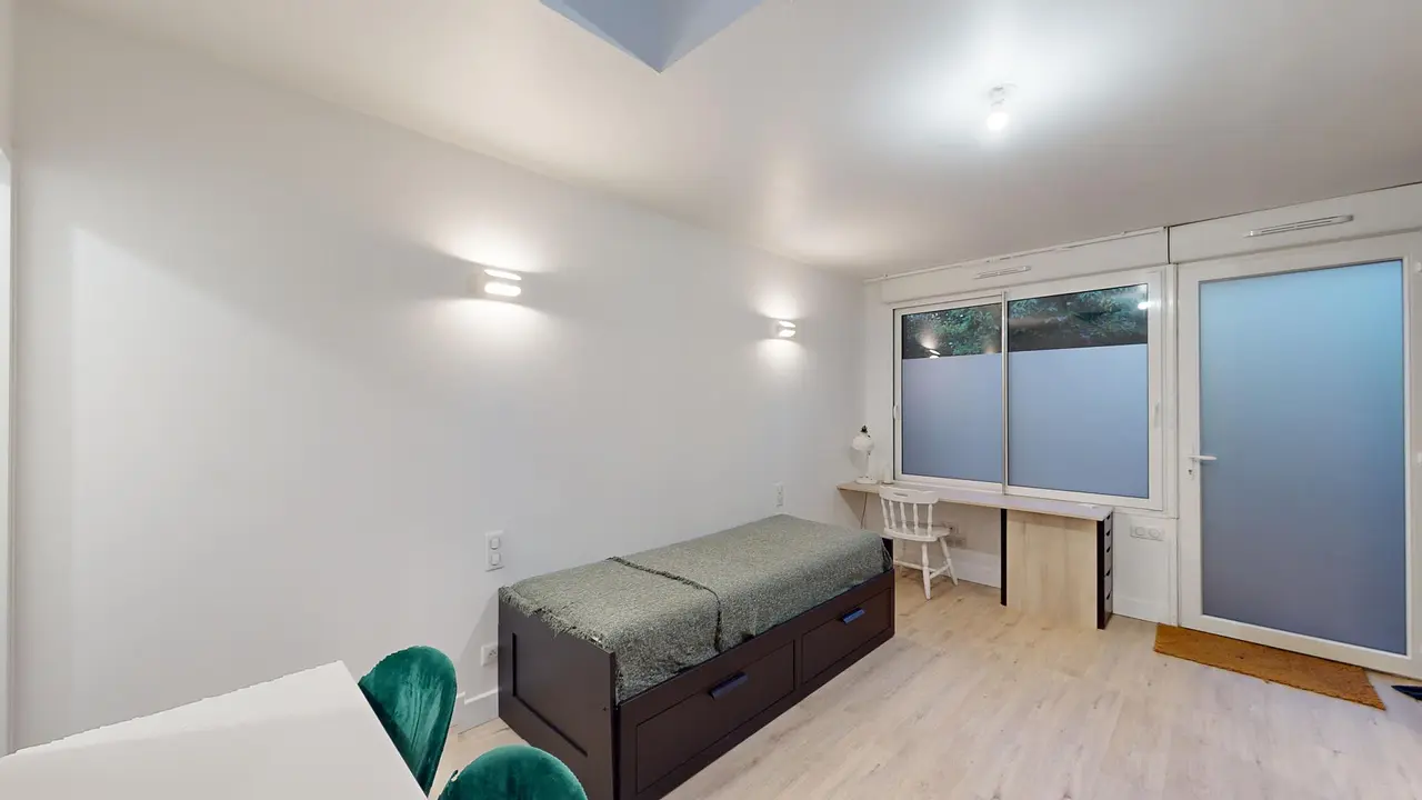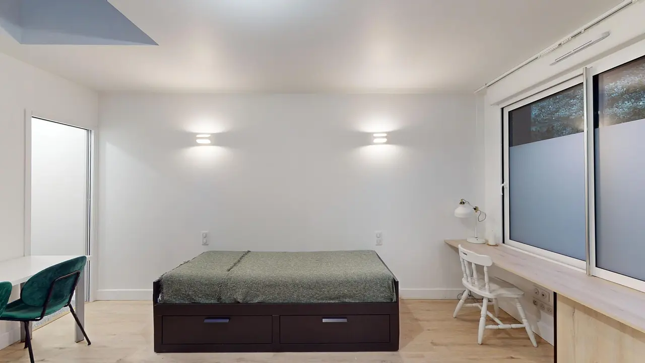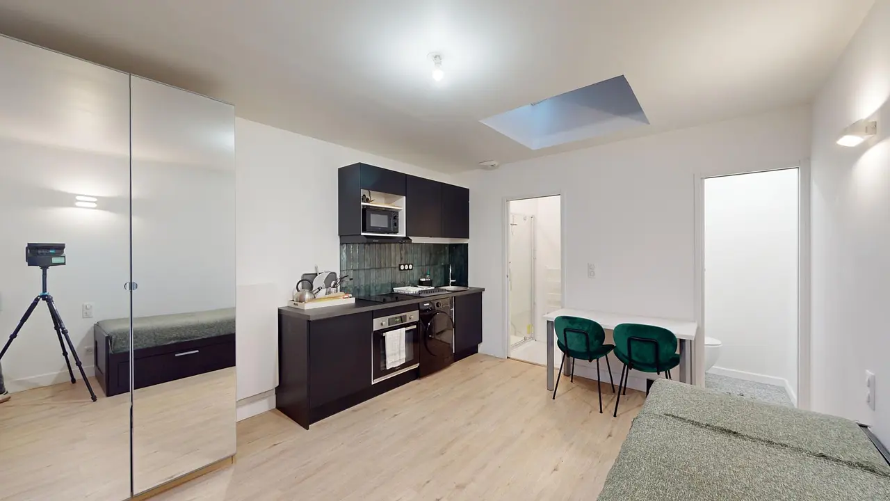 Ce studio s'ouvre sur une pièce de vie avec le coin nuit et la cuisine ouverte. La pièce est aménagée d'un lit gigogne, d'un bureau avec une chaise et une lampe, d'une table avec deux chaises ainsi que d'une armoire avec miroirs.