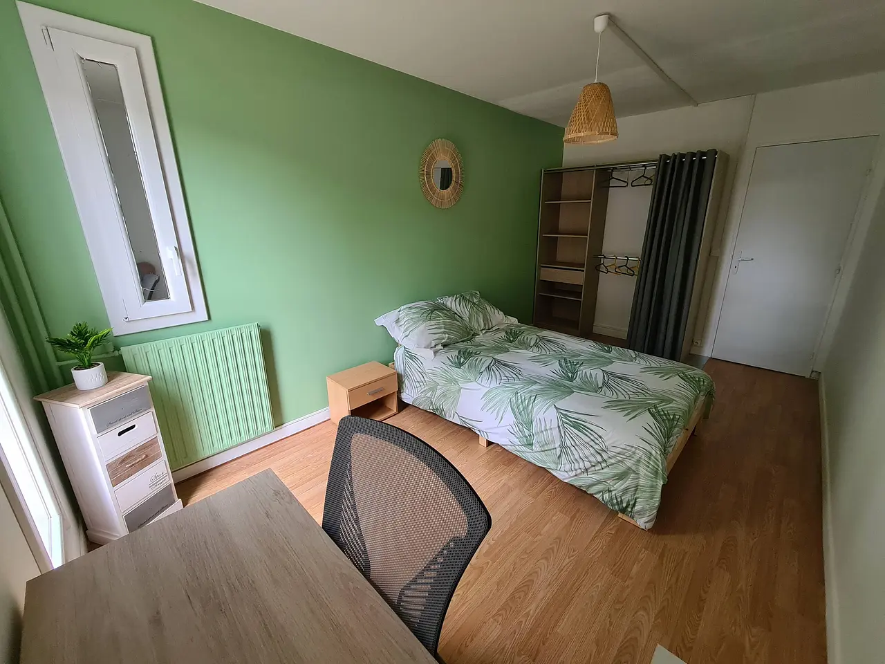 La chambre est louée avec un lit double, un bureau, un chevet et une penderie.