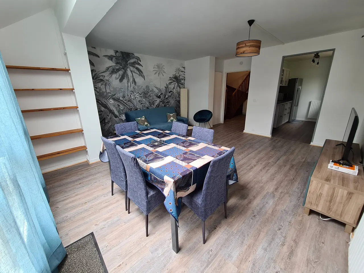 Cet appartement de 6 pièces est aménagé comme suit : un salon avec un canapé, table basse ainsi qu'une télévision. La cuisine est séparée du salon et tout équipée : un four, un lave-vaisselle, une machine à café, un micro-ondes, des plaques de cuisson, etc.