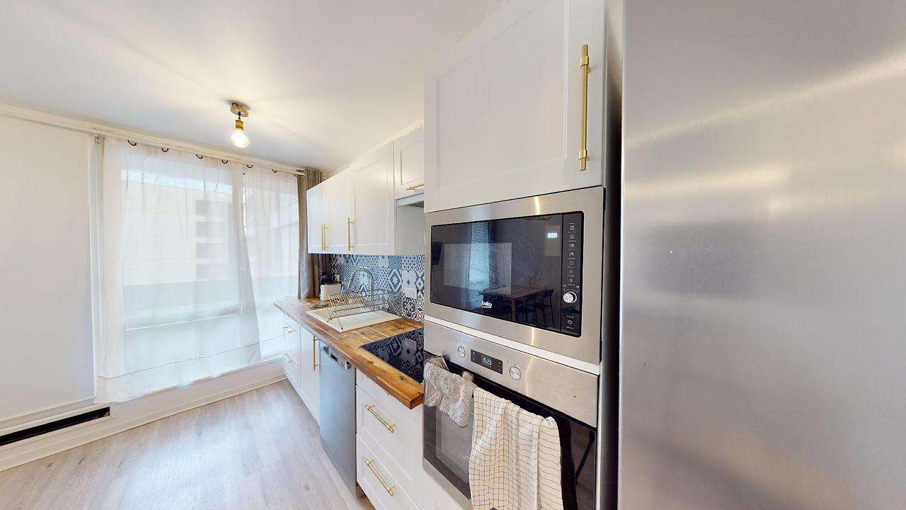La cuisine est équipée d'un frigidaire, d'un lave-vaisselle, de plaque de cuisson, d'un four et d'un micro-ondes, d'un évier et de rangement.
