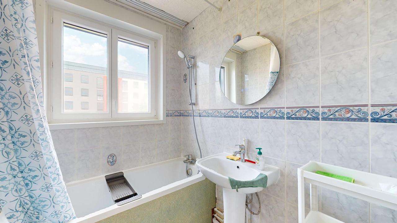 Une salle de bain moderne complète ce logement, elle est équipée d'une baignoire, d'un lavabo, d'un miroir et de rangements pratiques. Les WC et la machine à laver sont séparés de la salle d'eau.