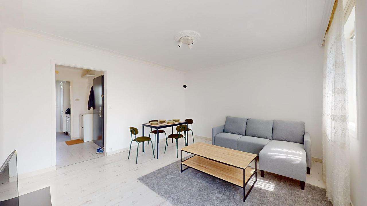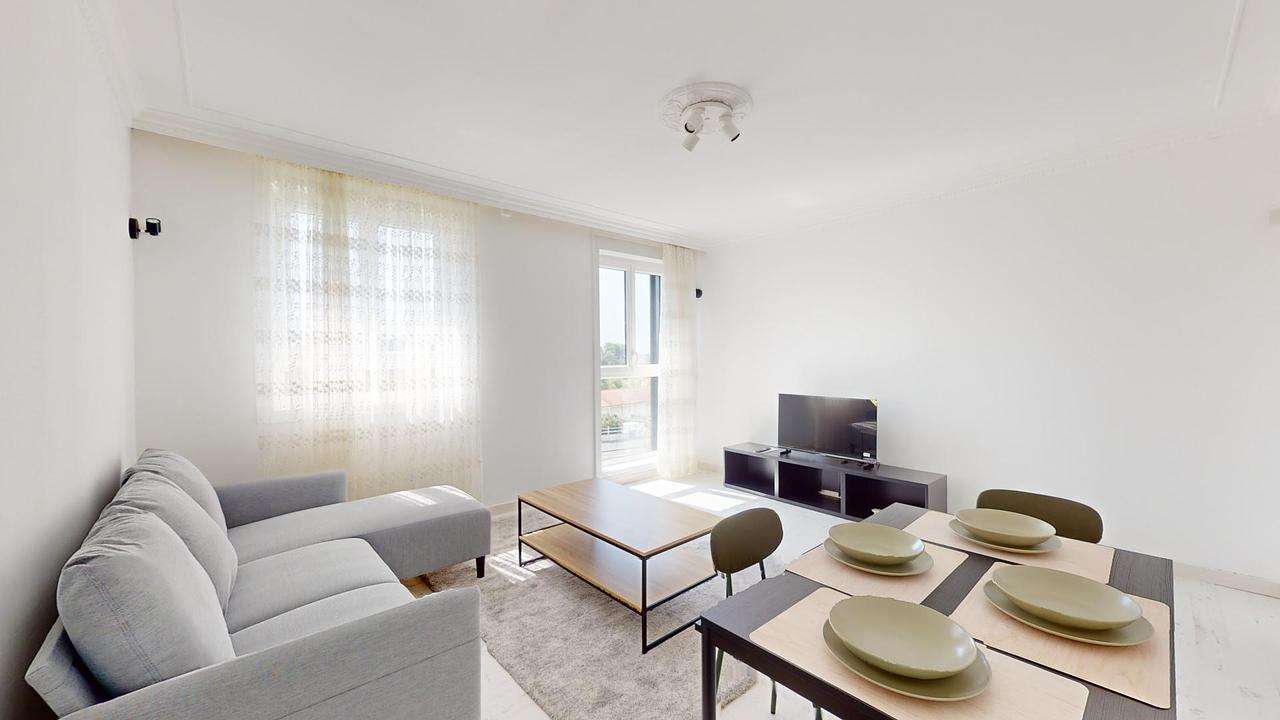 Un vaste salon vous attend, parfaitement aménagé avec un canapé, une table basse, une table à manger avec ses quatre chaises et un meuble TV avec une télévision. Un espace idéal pour se détendre ou recevoir vos invités. Les espaces de vie sont baignés de lumière naturelle grâce à deux grandes fenêtres, vous offrant un coin agréable et ensoleillé.