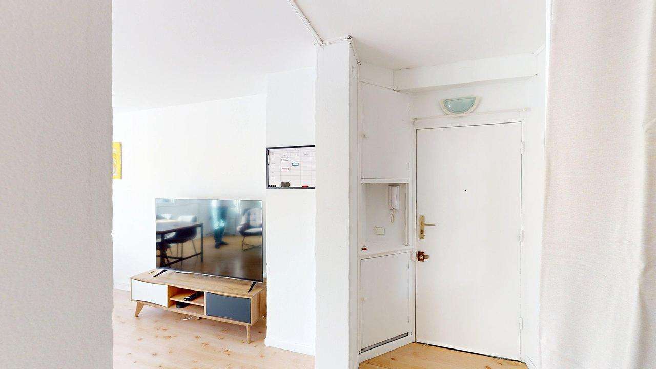 L’appartement dispose d’un séjour lumineux, aménagé avec un grand canapé, une table à manger et une télévision, offrant un espace convivial pour se retrouver entre colocataires.