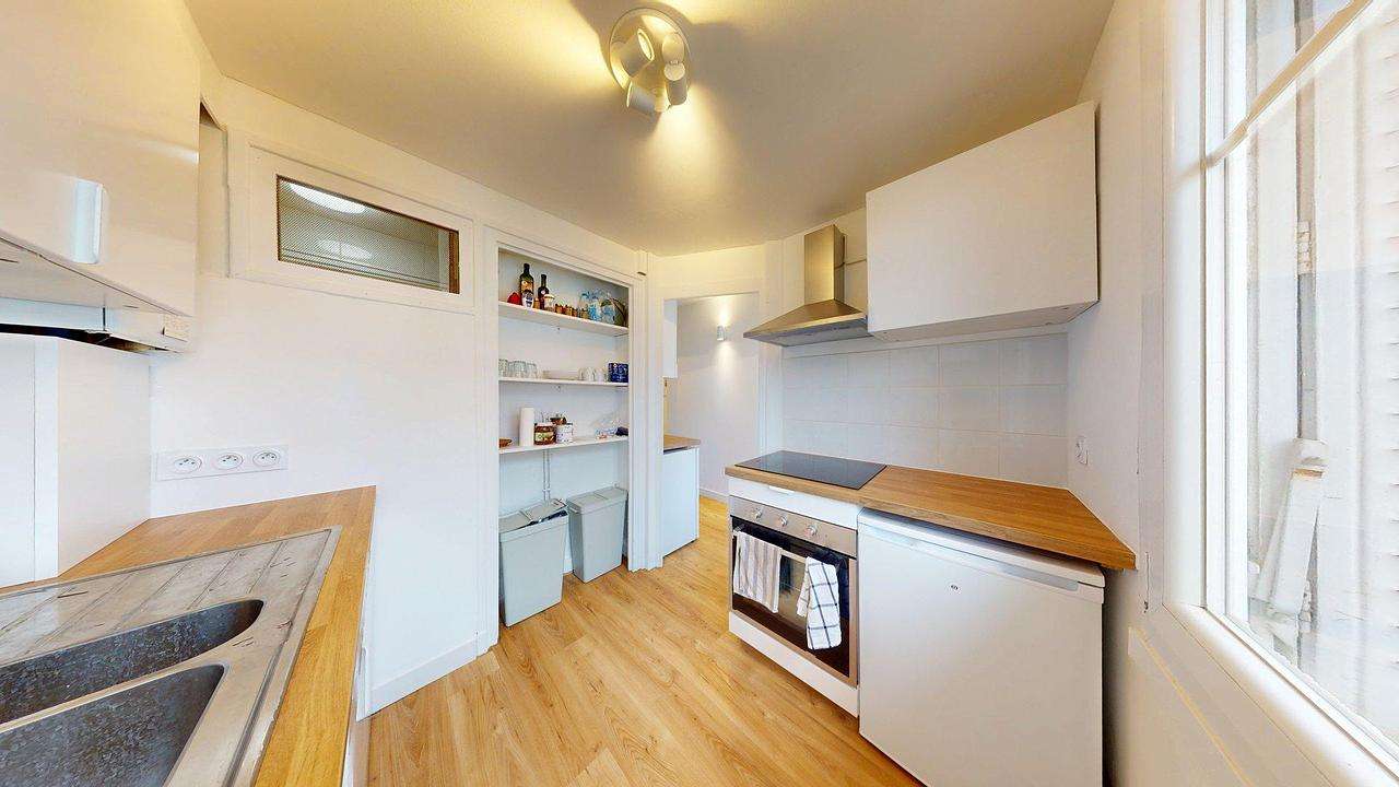 La colocation s’articule autour d’une cuisine lumineuse et fonctionnelle, équipée d’un four, d’un micro-ondes, d’un lave-vaisselle et d’une plaque de cuisson.