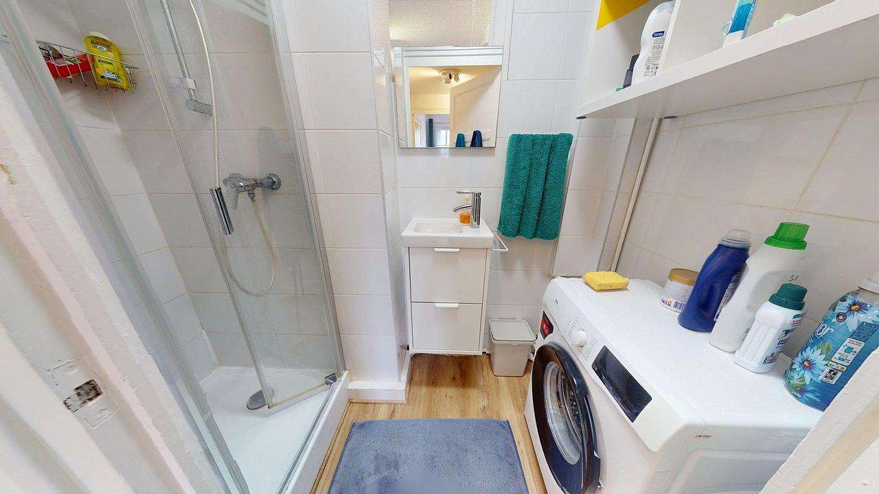 La salle d’eau, entièrement carrelée, dispose d’une douche moderne, d’un meuble vasque avec miroir et d’un lave-linge installé dans un espace dédié avec étagères de rangement.