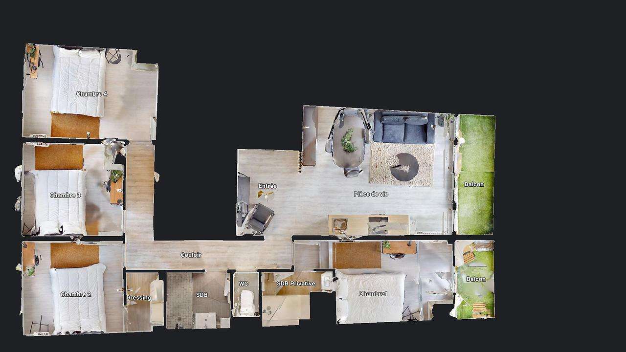 Le logement se compose de quatre chambres, d’une belle pièce de vie avec cuisine ouverte sur salon, de deux salles de bain dont une commune et la seconde privative attribuée à la chambre 1, d’un WC indépendant et de deux balcons dont un commun accessible par le salon, et le second à l’usage exclusif du locataire de la chambre 1.