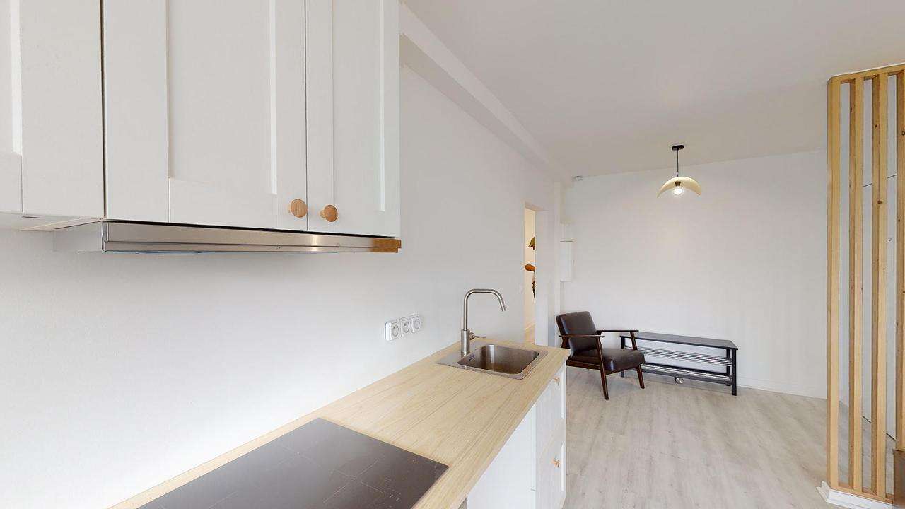 La cuisine est déjà équipée d’un four, de plaques de cuisson, d’une hotte, et de rangement, et s’ouvre un lumineux salon muni d’un canapé, d’une table basse et d’un tapis de sol et d’une table à manger accompagné de quatre chaises. Un charmant balcon avec pelouse synthétique vient compléter ces espaces.