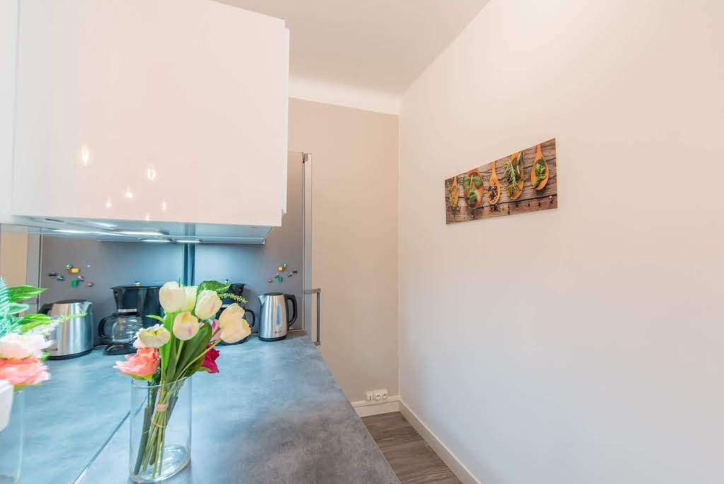 Les parties communes comprennent une cuisine moderne ouverte équipée avec tout le nécessaire : vaisselle, micro-ondes, four, lave-vaisselle, plaques de cuisson, etc.
