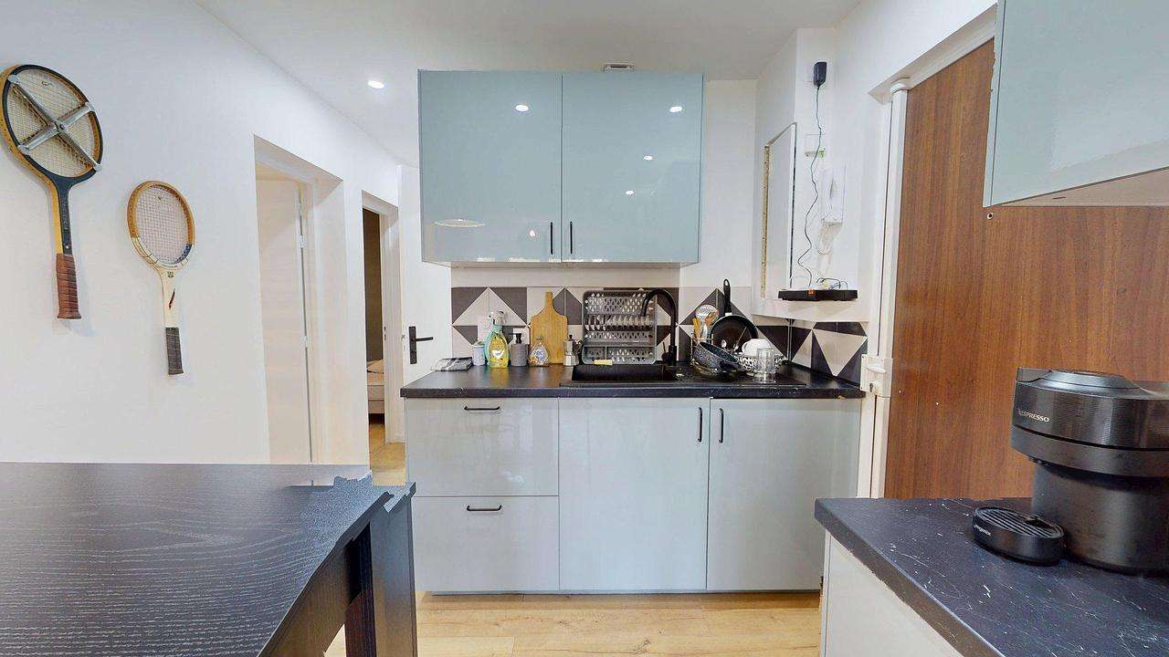 Cette colocation de quatre chambres s'ouvre sur une pièce de vie spacieuse et lumineuse. La cuisine ouvert est équipée d'un réfrigérateur congélateur, d'un four, de plaques de cuisson avec une hotte, d'un grille-pain, d'une machine à café, d'un micro-ondes, d'un évier avec égouttoir, de nombreux rangements ainsi que d'un mange-debout avec quatre chaises, idéal pour partager des repas entre colocataires.