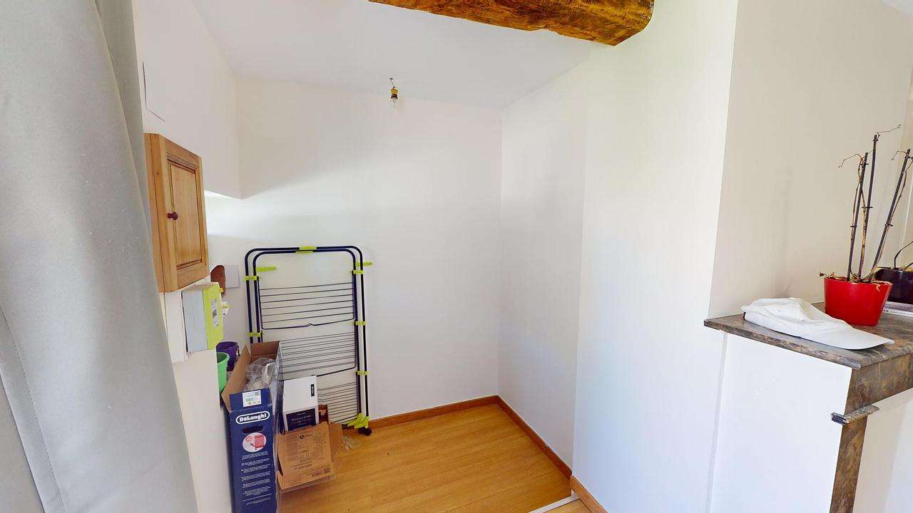 Cet appartement lumineux avec poutres apparentes est composé comme suit :