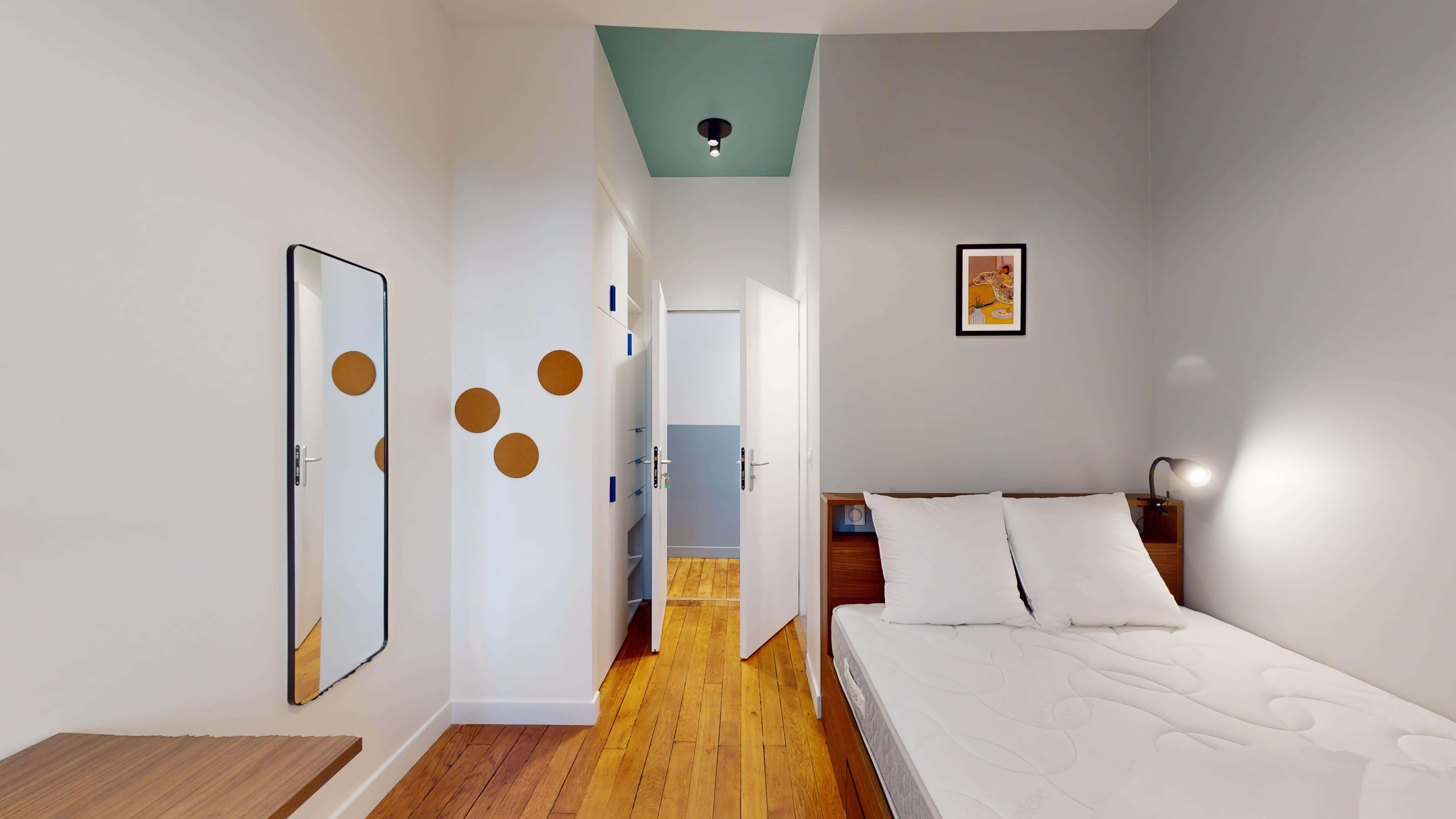 La chambre "Room for one person - 12" est un cocon douillet de 13m2 situé au 2ème étage. Elle est parfaite pour une personne avec son lit double confortable, son bureau pour travailler et une armoire pour ranger toutes vos affaires. La salle de bain privée est équipée d'une douche moderne, d'un lavabo et de toilettes séparées pour votre intimité.