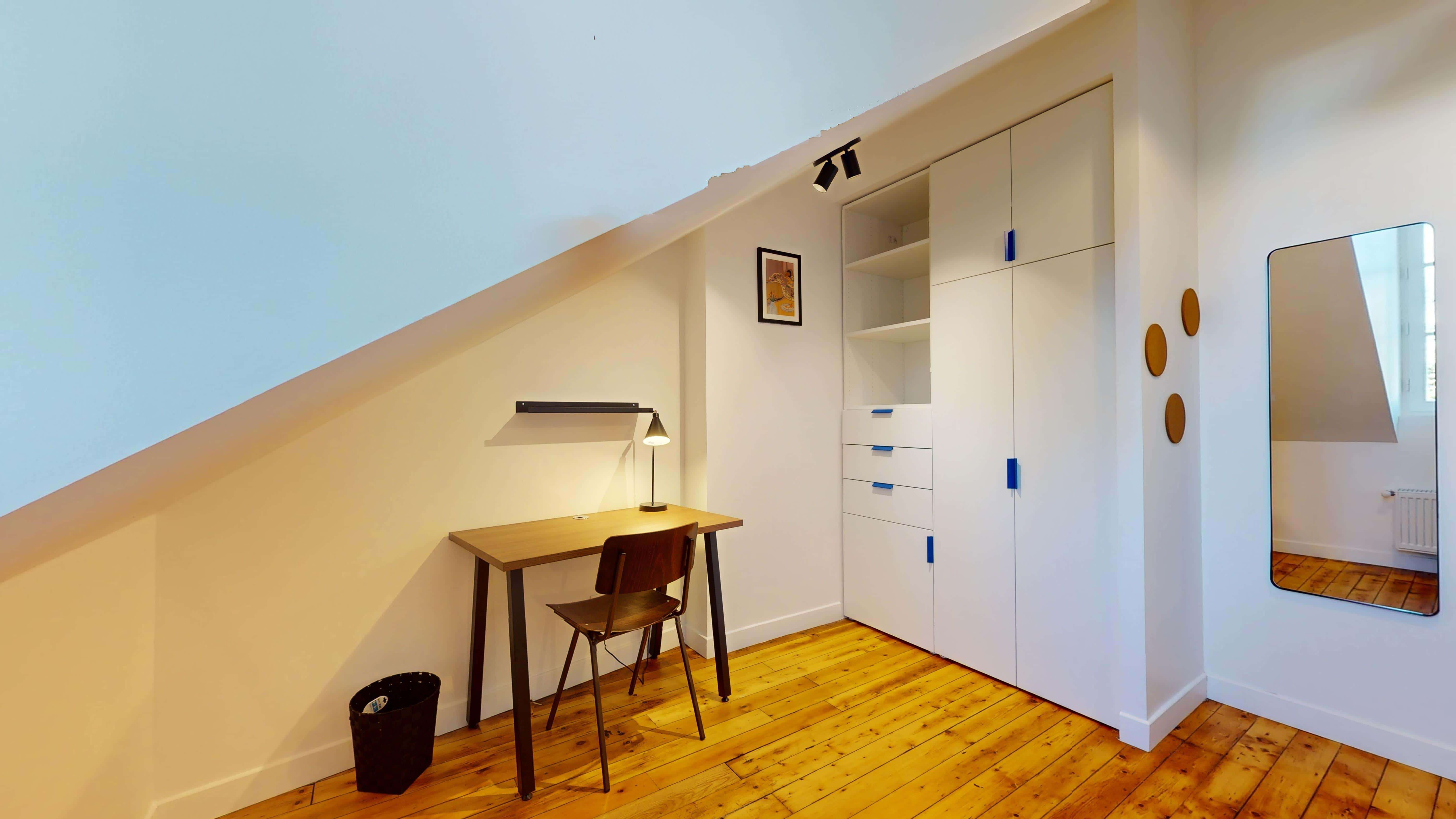 La chambre "Room for one person - 9", située au 2ème étage, est parfaite pour une personne. Elle est meublée d'un lit double avec rangement intégré, d'une armoire spacieuse, d'un bureau pratique pour travailler et d'une chaise confortable. La salle de bain partagée est équipée d'une douche moderne. La chambre dispose également d'une connexion internet haut débit et de tout le nécessaire pour un confort quotidien.