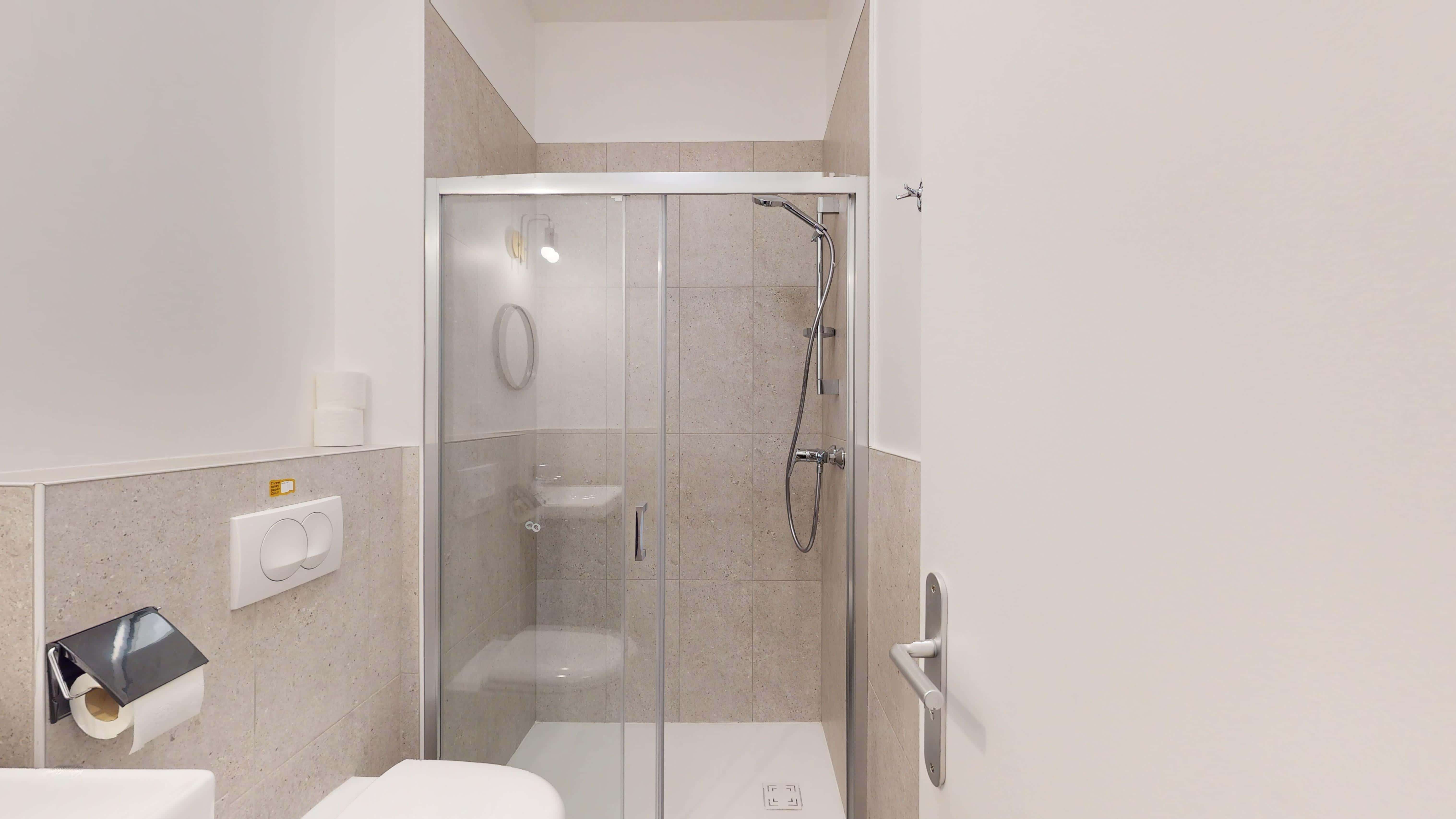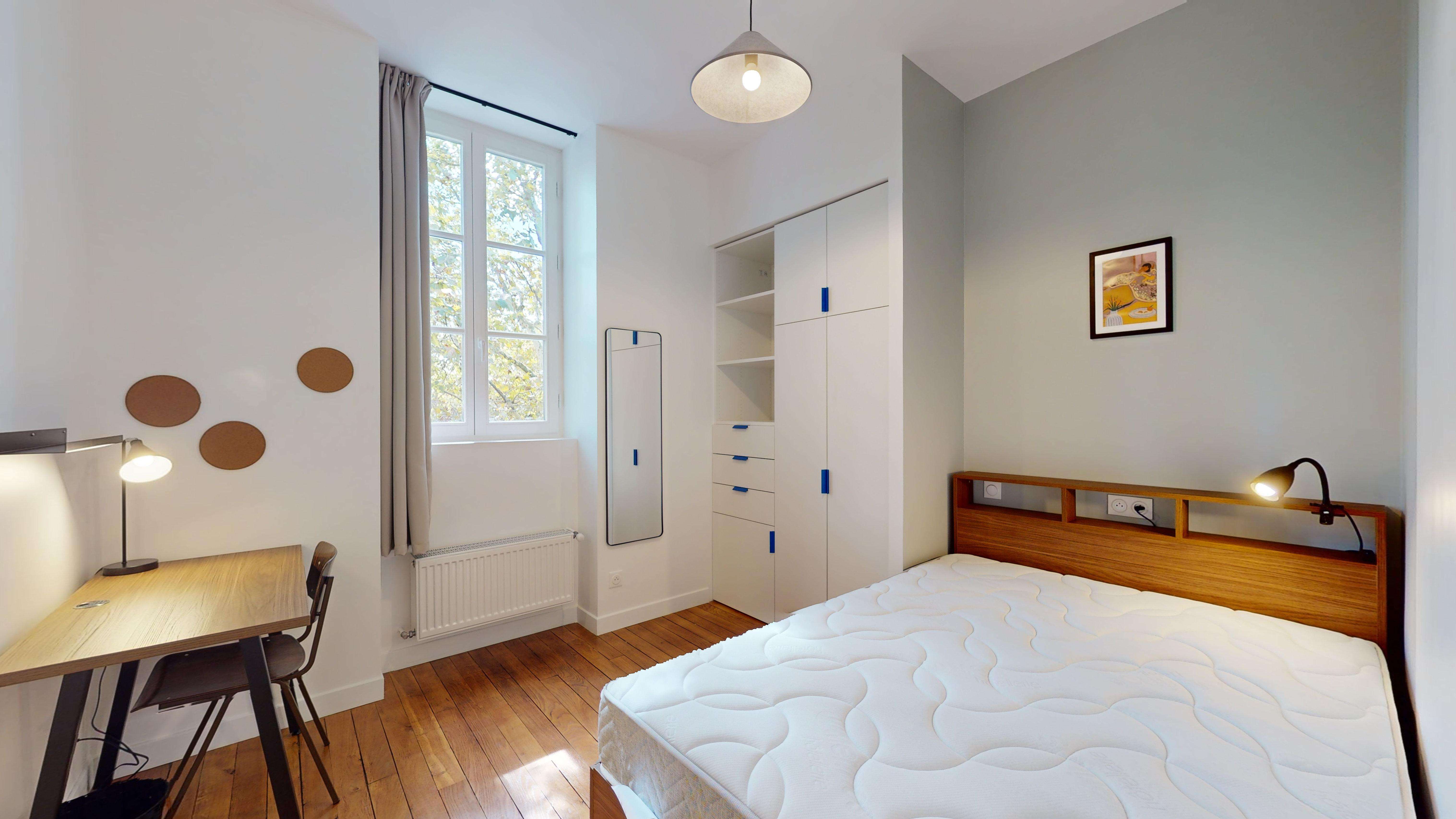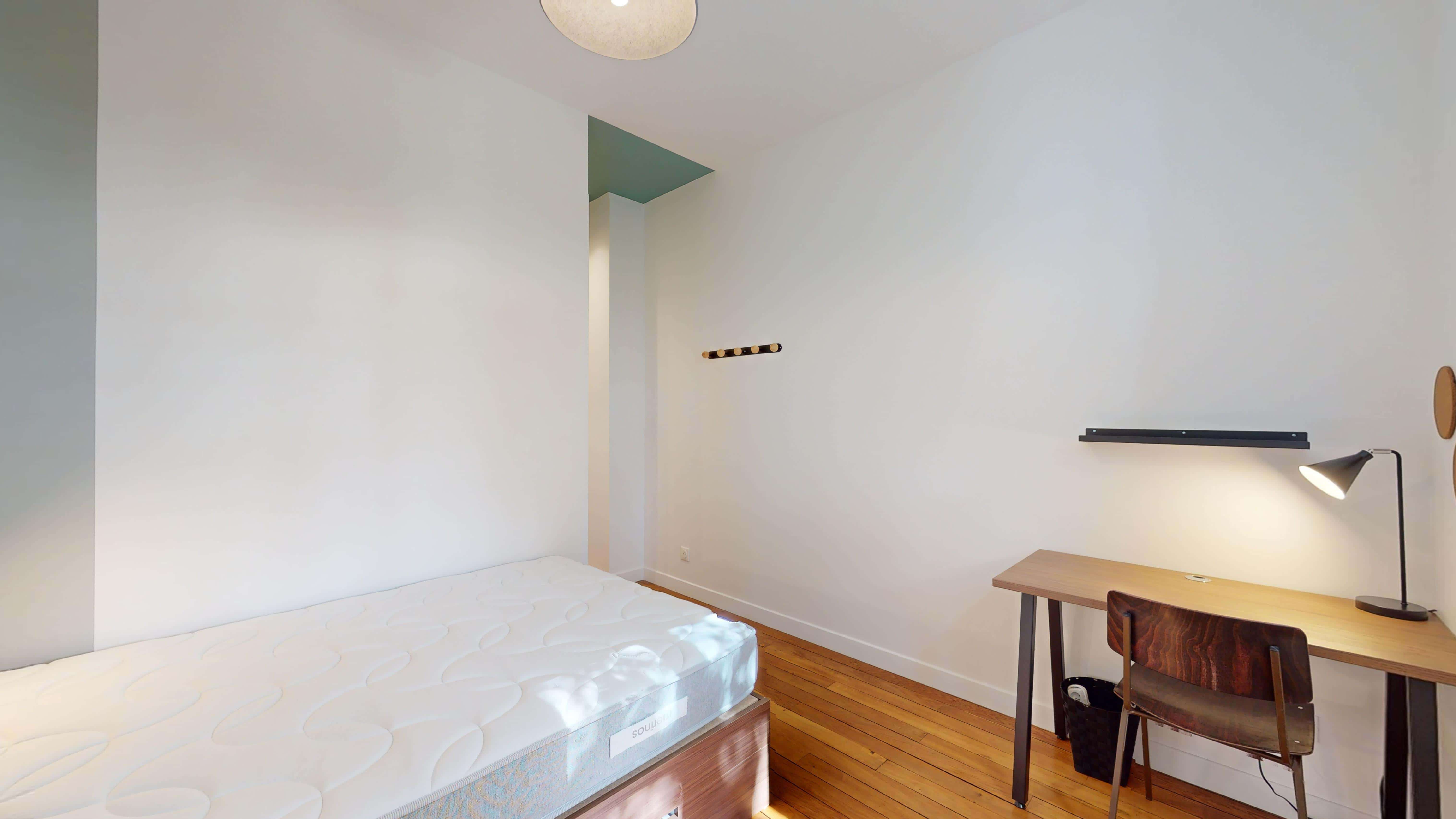 La chambre "Room for one person - 13", située au 2ème étage, est un cocon personnel de 15m2 avec tout le nécessaire pour un confort optimal. Elle dispose d'un lit double avec rangement, d'une armoire spacieuse pour vos affaires, d'un bureau et d'une chaise pour travailler ou étudier, ainsi que d'une salle de bain privée avec douche. La chambre est également équipée d'internet haut débit pour rester connecté.