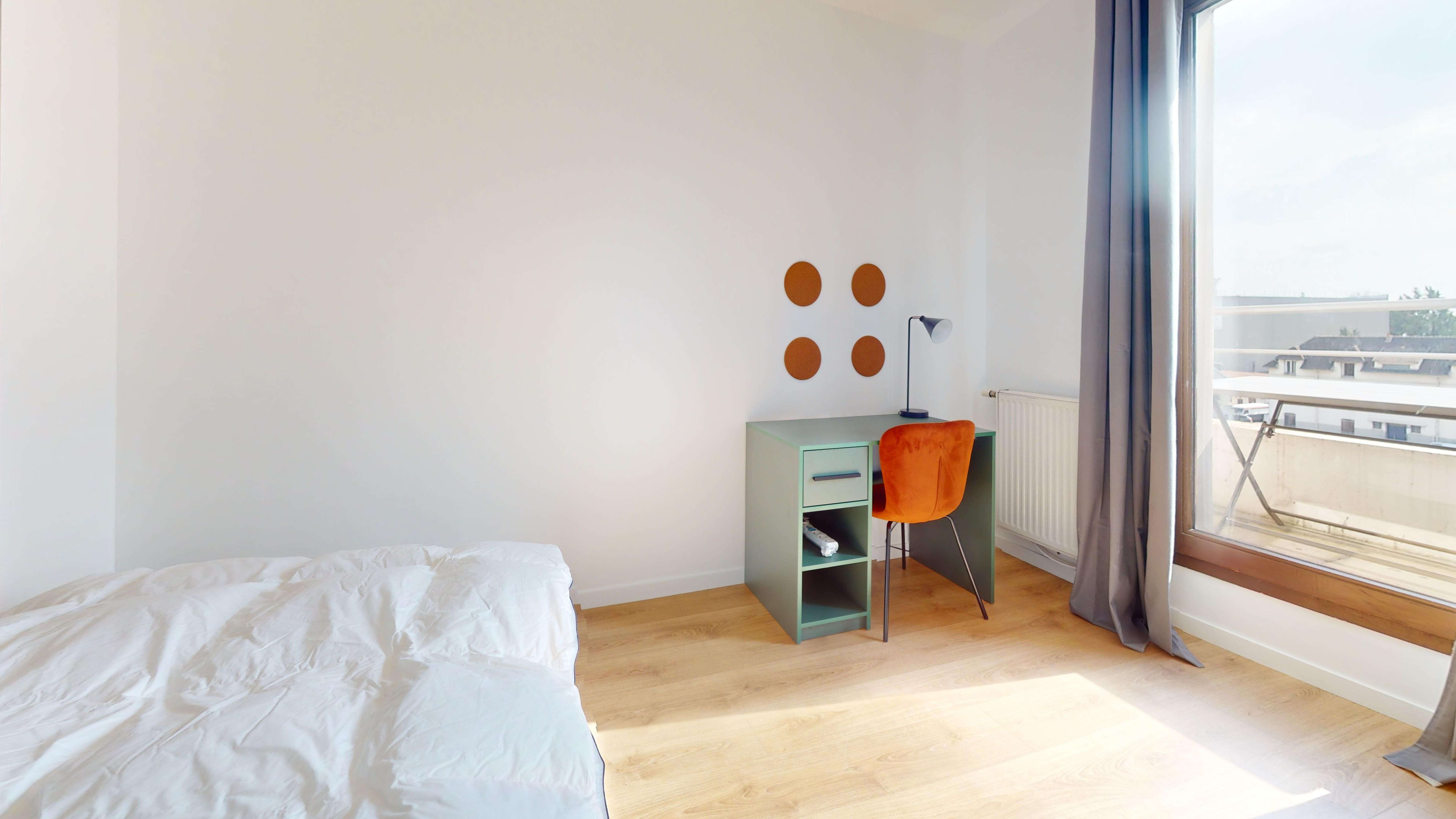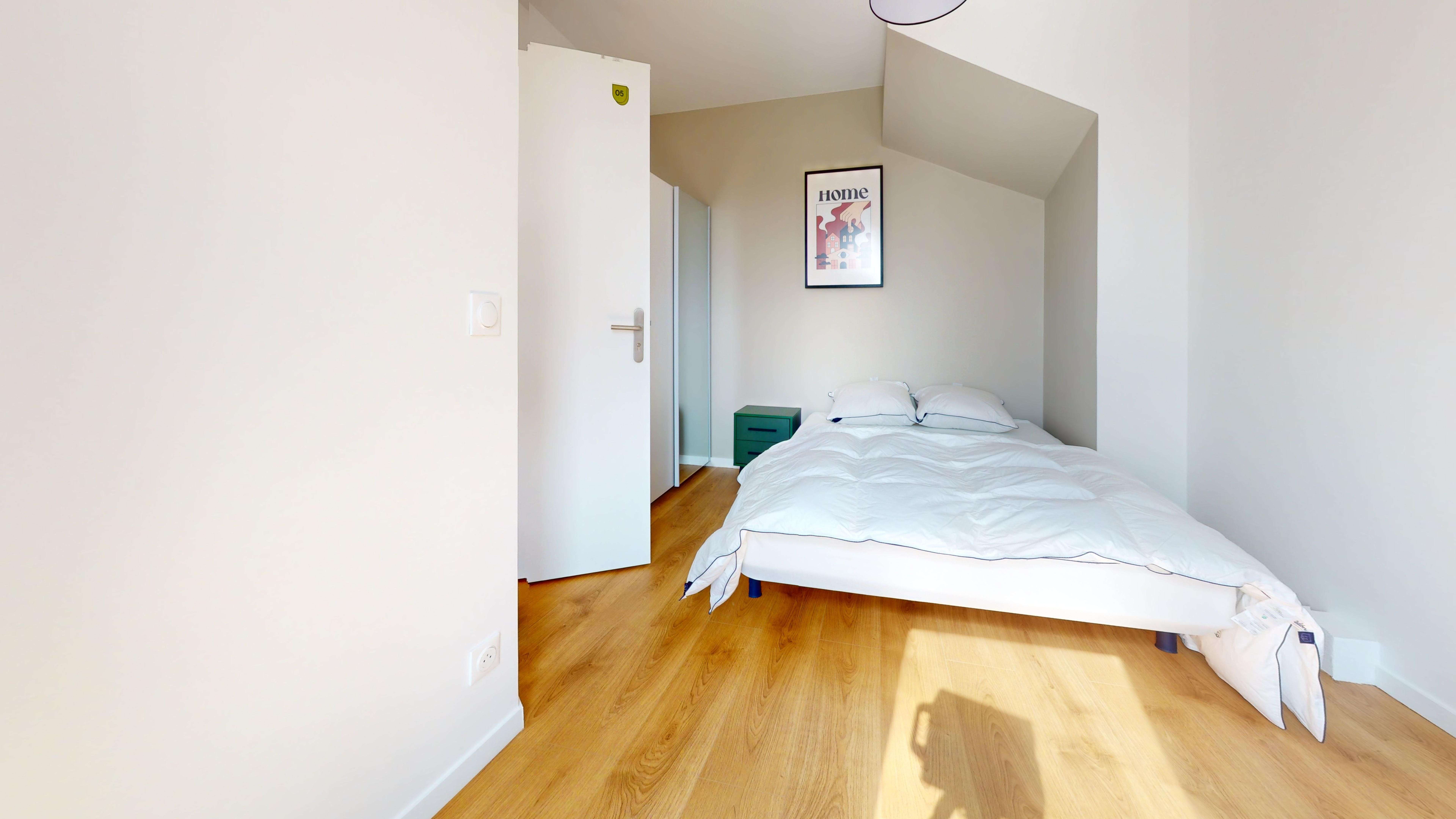 La chambre "Room for one person - 5" est idéale pour une personne. Elle est meublée avec un lit double confortable, une armoire pour vos affaires, une chaise et un bureau pour travailler ou étudier. La chambre partage une salle de bain moderne avec d'autres locataires. Elle est bien éclairée et offre tout le confort nécessaire avec des équipements comme une connexion internet haut débit.