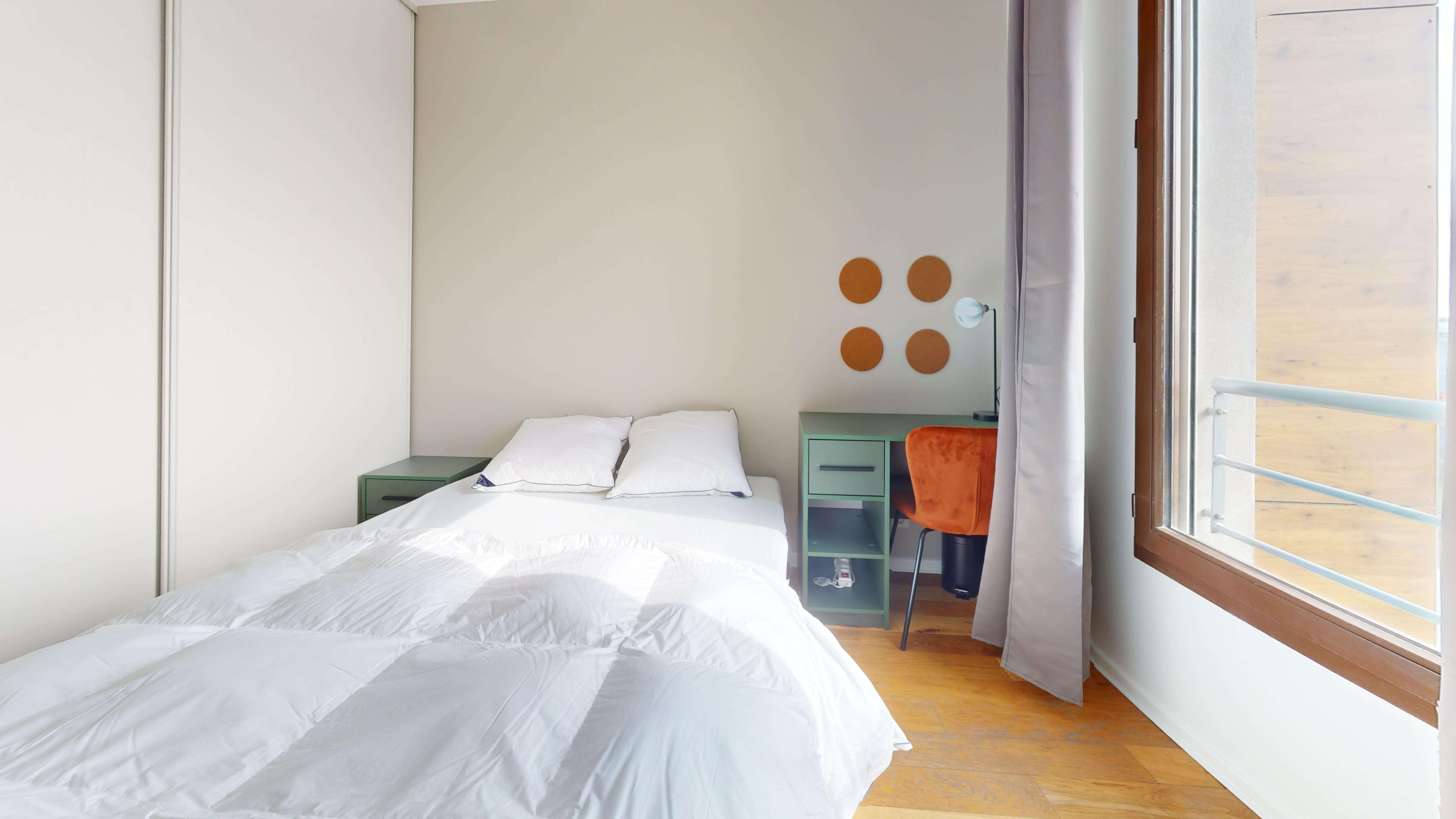 La chambre "Room for one person - 3" est spécialement conçue pour une personne. Elle offre un lit double confortable, une armoire pour vos affaires, une chaise et un bureau pour travailler ou étudier. Vous partagerez une salle de bain moderne avec d'autres locataires, et cette chambre a également l'avantage de partager un balcon avec une autre chambre, offrant un espace extérieur privé.