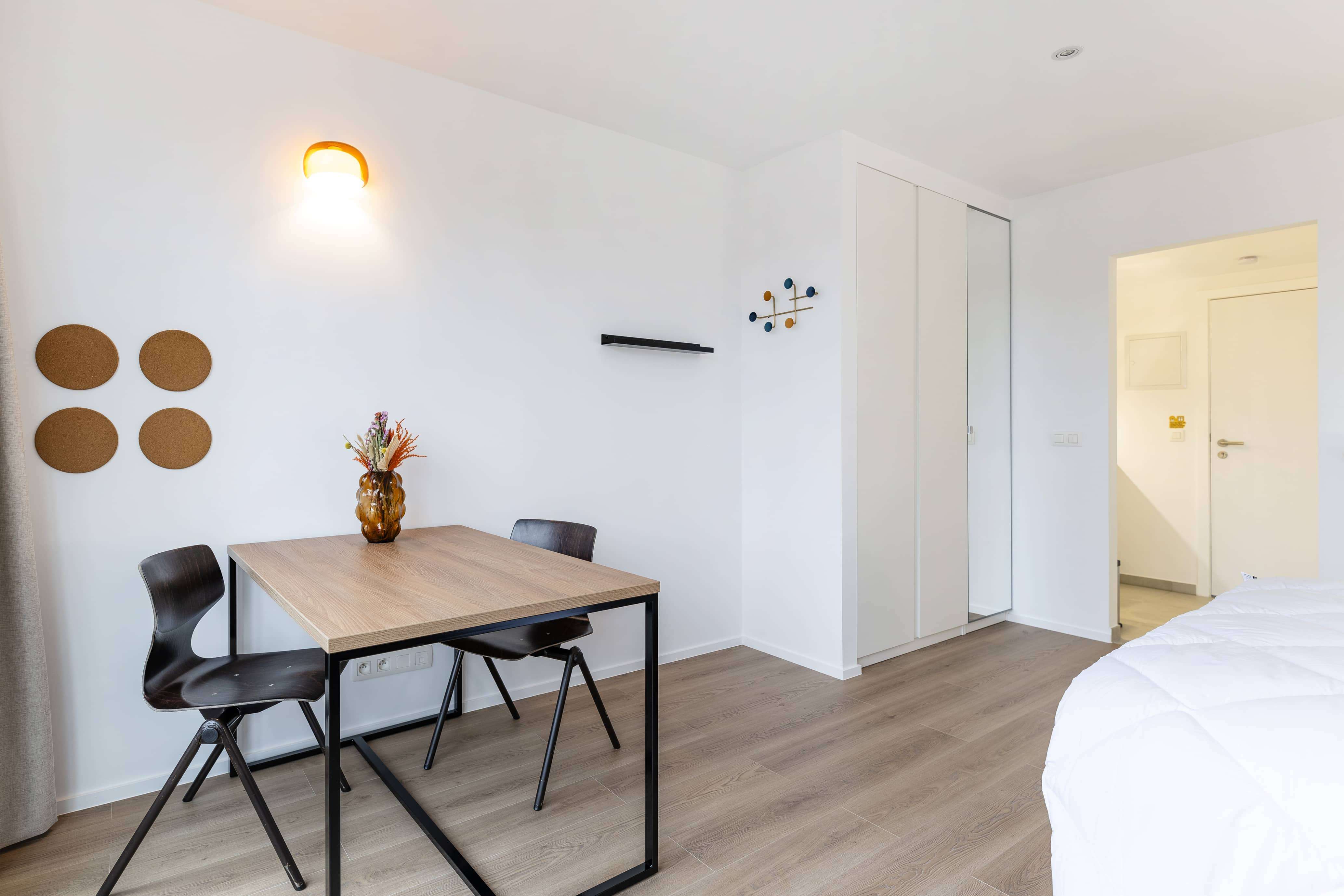 Le Studio for two people - 012 est un espace chaleureux et fonctionnel situé au rez-de-chaussée. Il est parfait pour deux personnes avec sa salle de bain privée, sa kitchenette équipée, un lit double confortable, des chaises, une table pratique et une penderie pour vos affaires.