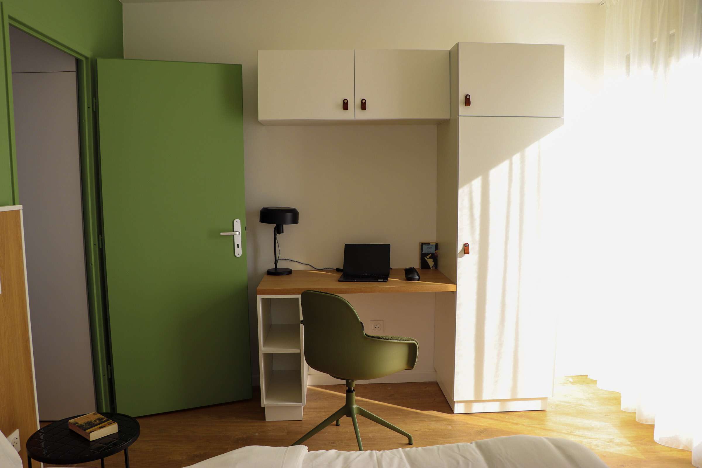 Découvrez notre appartement confortable et fonctionnel à la résidence Ivrywood, parfait pour deux personnes. Avec ses 53 m² bien agencés, cet espace de vie comprend une chambre séparée avec un lit double et une armoire pour ranger vos affaires. La cuisine-salon est équipée pour faciliter votre quotidien : vous y trouverez un évier, deux plaques de cuisson, un micro-ondes, un petit réfrigérateur et même un lave-vaisselle. Le salon est aménagé avec un canapé-lit douillet, une télévision et une grande table avec des chaises pour vos repas ou pour travailler. L'appartement dispose aussi d'une salle de bain privée avec douche. Et pour plus de commodité, vous avez accès à une buanderie, une salle de sport et une terrasse commune.
