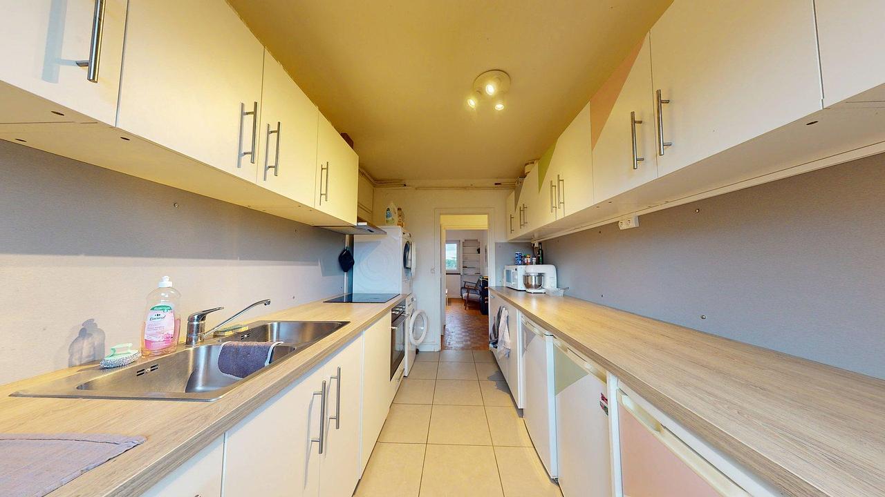 La cuisine, indépendante et entièrement équipée, dispose de nombreux rangements et d’un long plan de travail très pratique. Elle est aménagée avec un four, des plaques de cuisson, une hotte, un lave-vaisselle, un micro-ondes ainsi qu’un lave-linge et un sèche-linge.