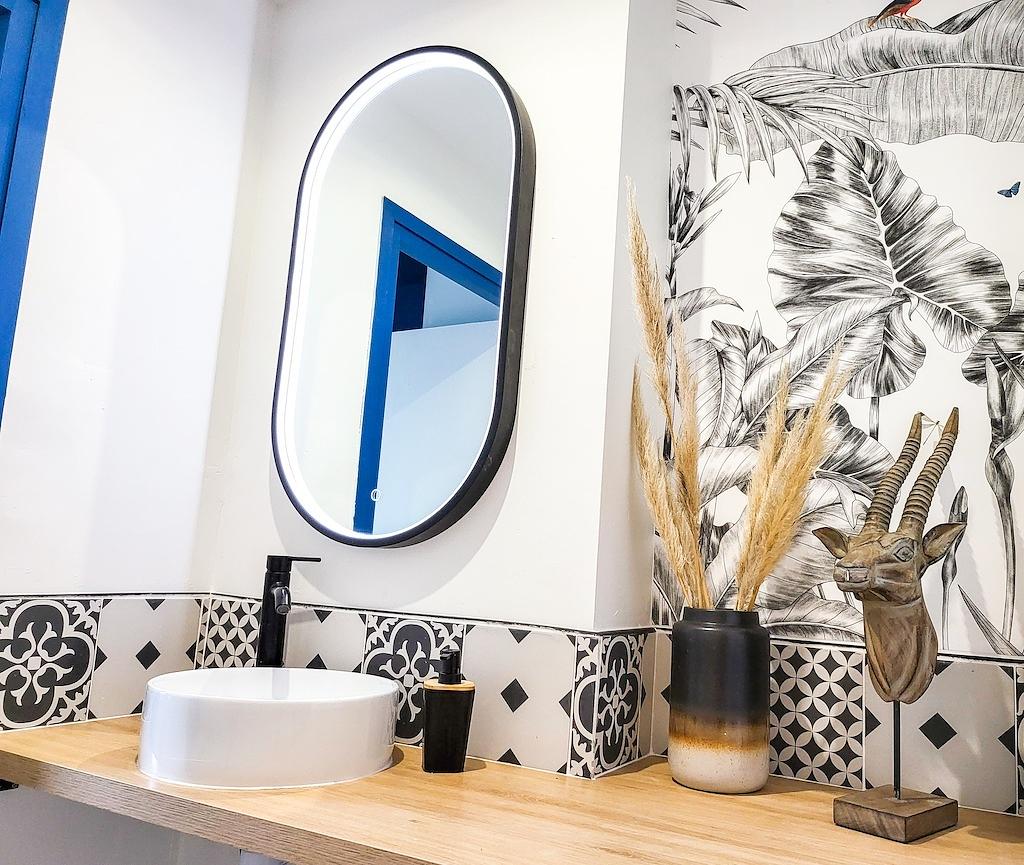 Deux salles d'eau avec des lavabos, un miroir, un WC, une douche, une machine à laver, un sèche-linge ainsi que des étagères et un sèche-serviette.