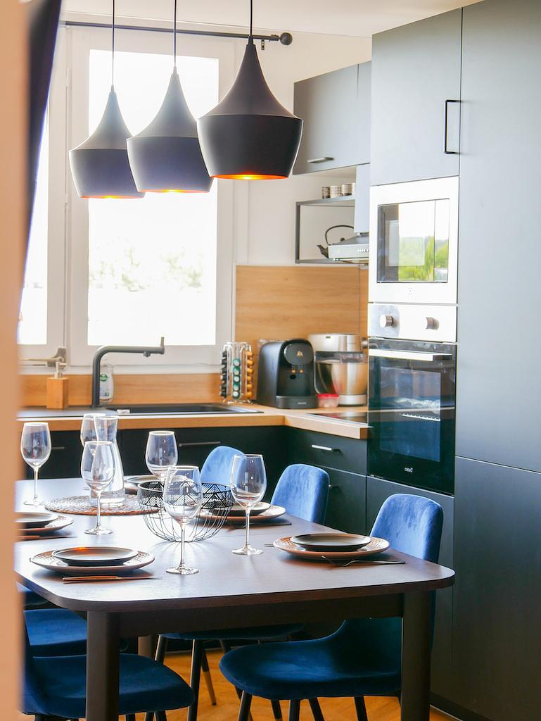 Une cuisine, ouverte sur le salon avec des plaques de cuissons, une hotte, un four, un micro ondes, un four, un évier, une machine à café et de nombreux rangements.