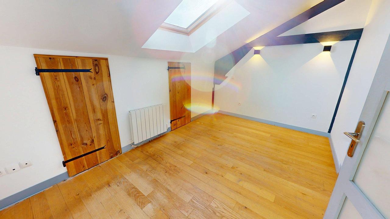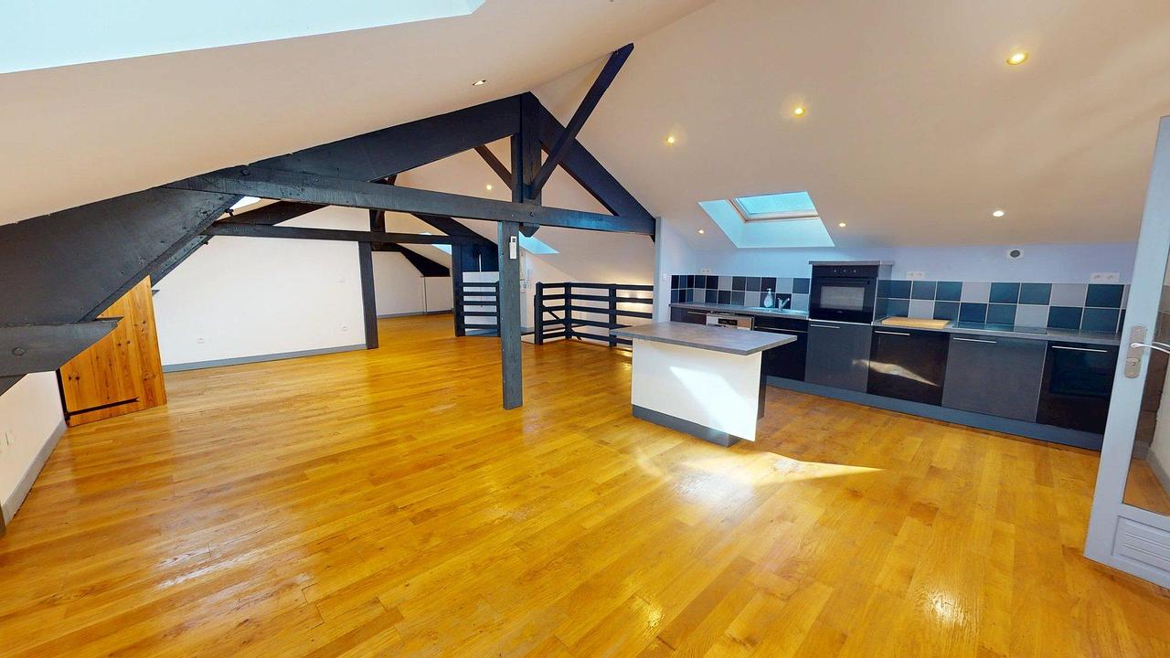 Sous combles, ce logement séduit par ses beaux volumes et sa luminosité, renforcés par des fenêtres de toit et de larges ouvertures. L’espace de vie principal s’articule autour d’un grand séjour de 55 m² avec poutres apparentes et parquet en chêne massif, apportant un cachet authentique. La cuisine ouverte, moderne et fonctionnelle, dispose d’un îlot central et d’équipements complets (plaques, four, lave-vaisselle) ainsi que de nombreux rangements.