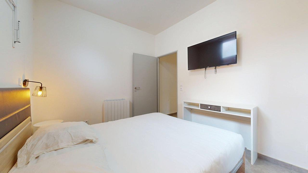 La chambre est meublée avec un lit double, de grands placards de rangements, tables de chevet, meuble télévision et télévision.