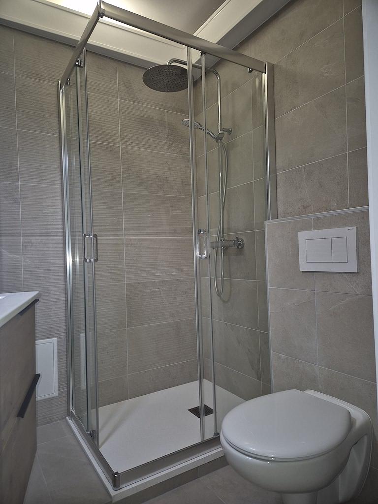 Une salle d’eau refaite à neuf, comprenant une douche, un sèche-serviettes, un meuble vasque avec miroir et des WC intégrés.