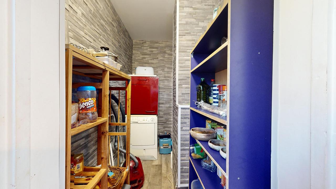 La cuisine est équipée d'un réfrigérateur avec congélateur, d'un four, de plaques de cuisson, d'un lave-vaisselle, d'un lave-linge et d'une table avec 4 chaises. En plus de ses nombreux rangements, une arrière-cuisine complète cet espace.