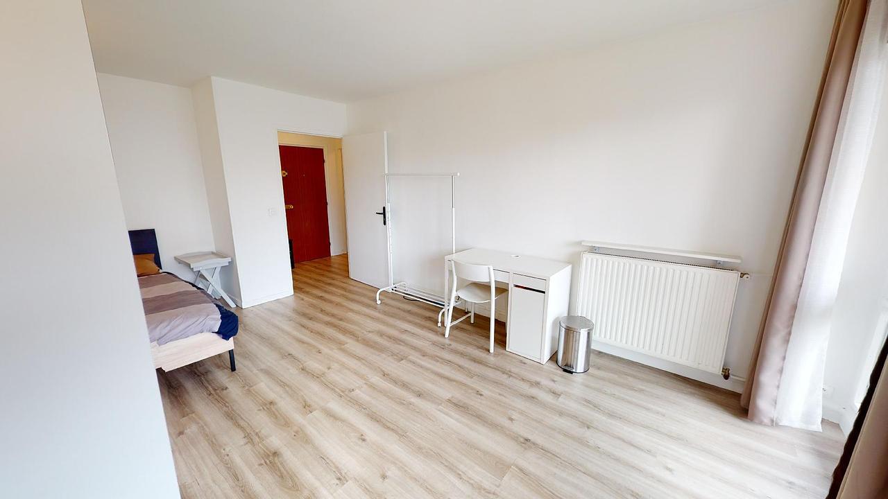 Cette spacieuse et lumineuse chambre (13 m²) est composée d’un lit double, d’une table de chevet pliable, d’un bureau avec chaise, d’une poubelle, d’une panière à linge et d’une penderie avec miroir.