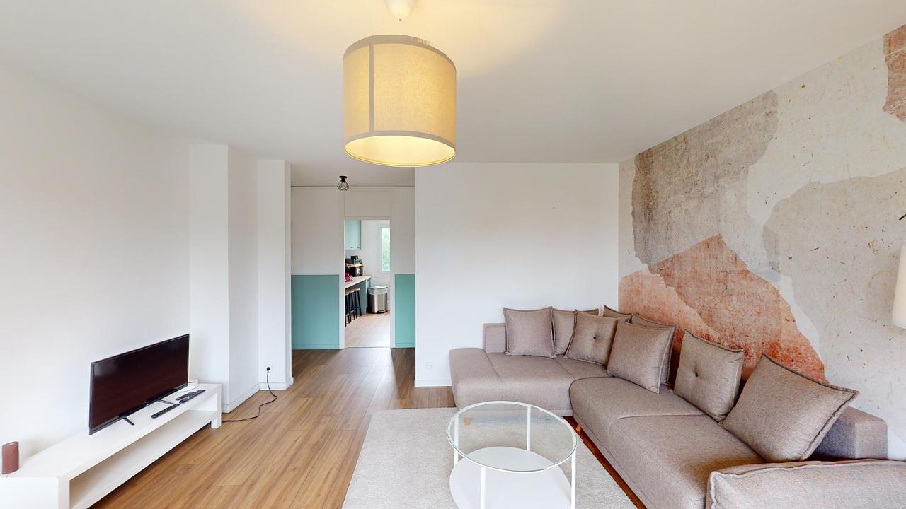 Cet appartement de 5 pièces s'ouvre sur un séjour lumineux aménagé d'un canapé d'angle, d'une table basse, d'un meuble TV avec télévision ainsi que d'une table avec quatre chaises.