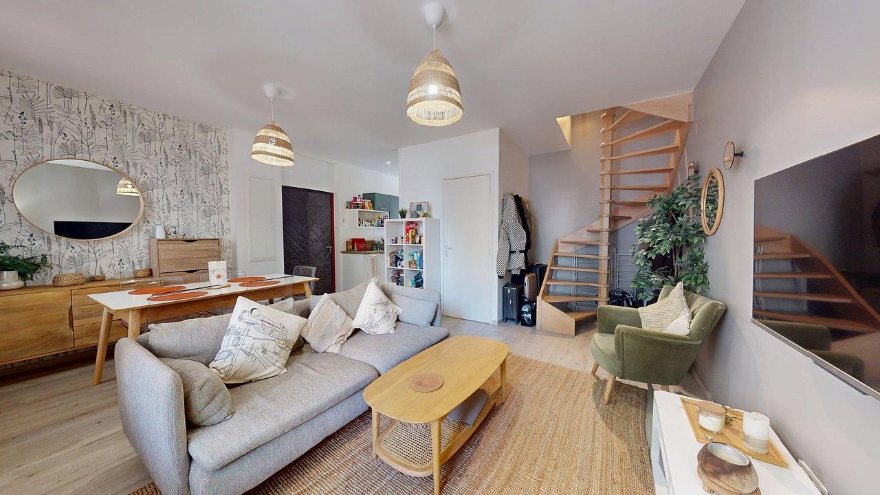 La pièce de vie conviviale est aménagée avec soin : canapé confortable, fauteuil design, télévision écran plat et table à manger spacieuse vous invitent à partager des moments agréables entre colocataires.