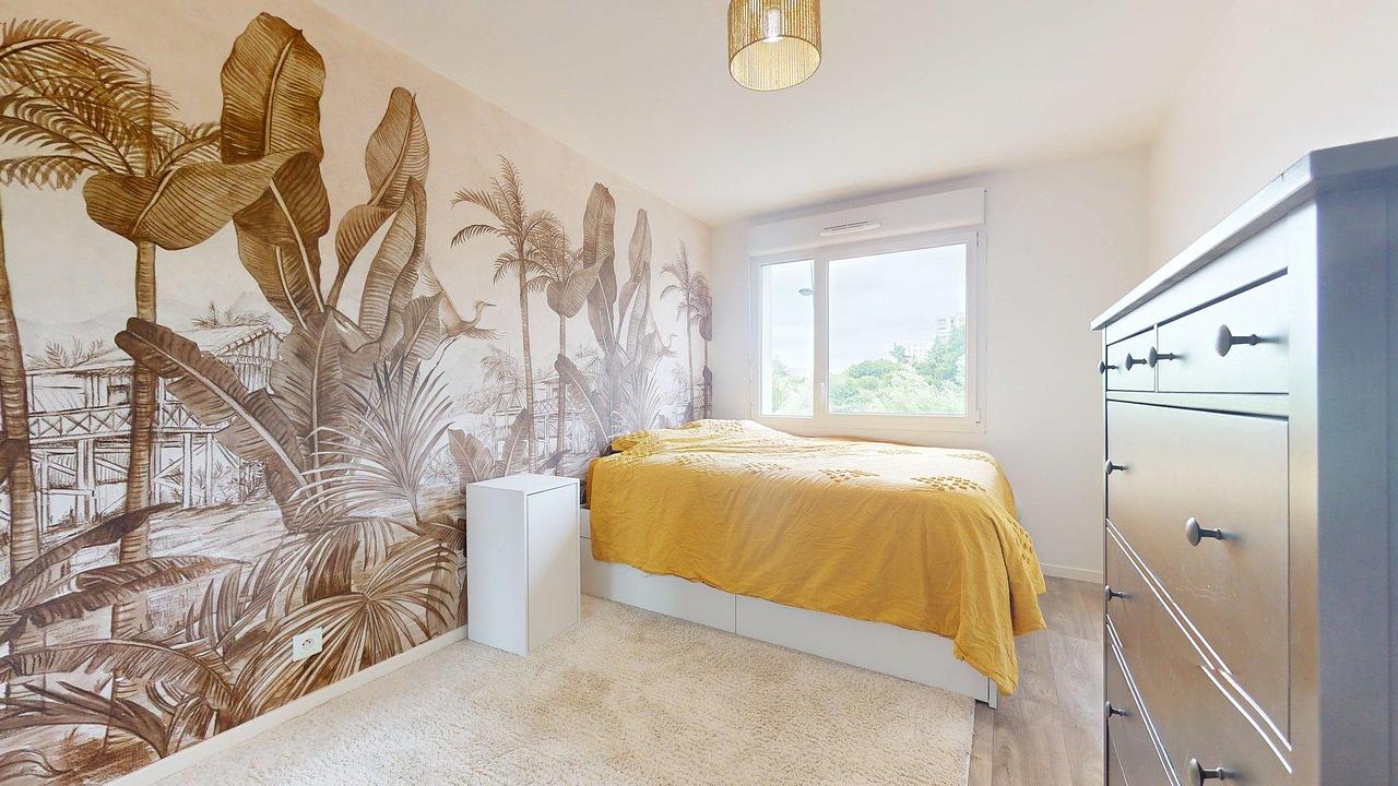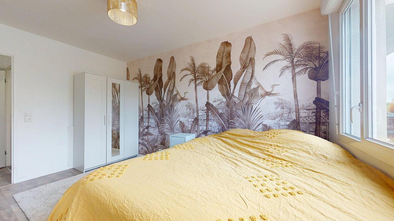 Une deuxième chambre, équipée d’un lit simple, d’un placard mural, d’une étagère et d’un bureau. Elle bénéficie d’un accès direct au balcon.