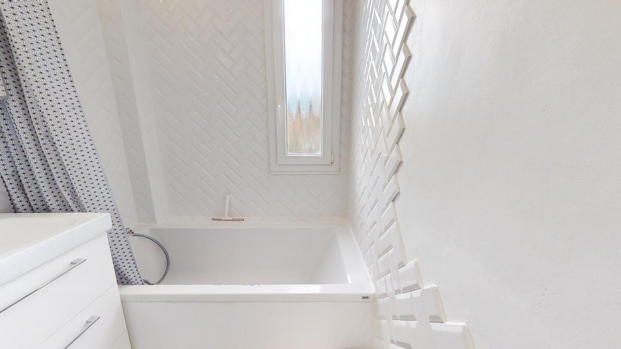 De plus, une salle de bain élégante est pourvue d'un meuble vasque et d'une baignoire, tandis qu'un WC indépendant complète l'aménagement.