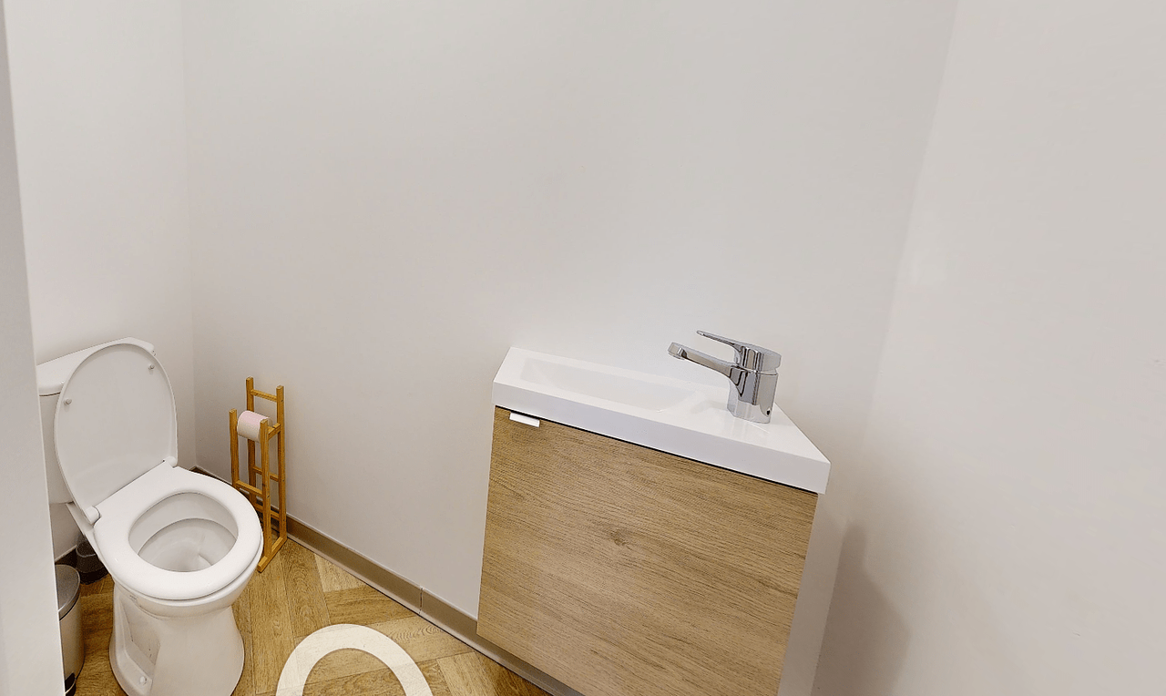 Vous disposez aussi de votre salle de bain privée, équipée d'une douche, une vasque et un toilette.