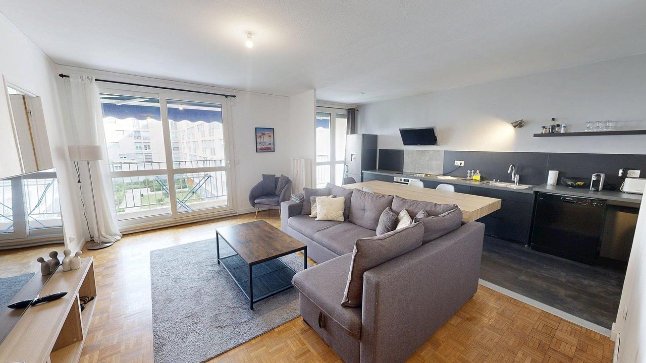 La cuisine est très bien équipée (four, lave-vaisselle, plaques de cuisson, hotte, frigidaire, rangements) et bénéficie d’une table à manger accompagnée de six chaises pour partager des repas conviviaux. Le salon est agencé avec du mobilier de goût, et s’équipé d’un canapé, d’une table basse, d’un meuble TV accompagné de sa TV, et d’un fauteuil. Ce salon donne accès à un agréable balcon avec vue sur une cour intérieure.