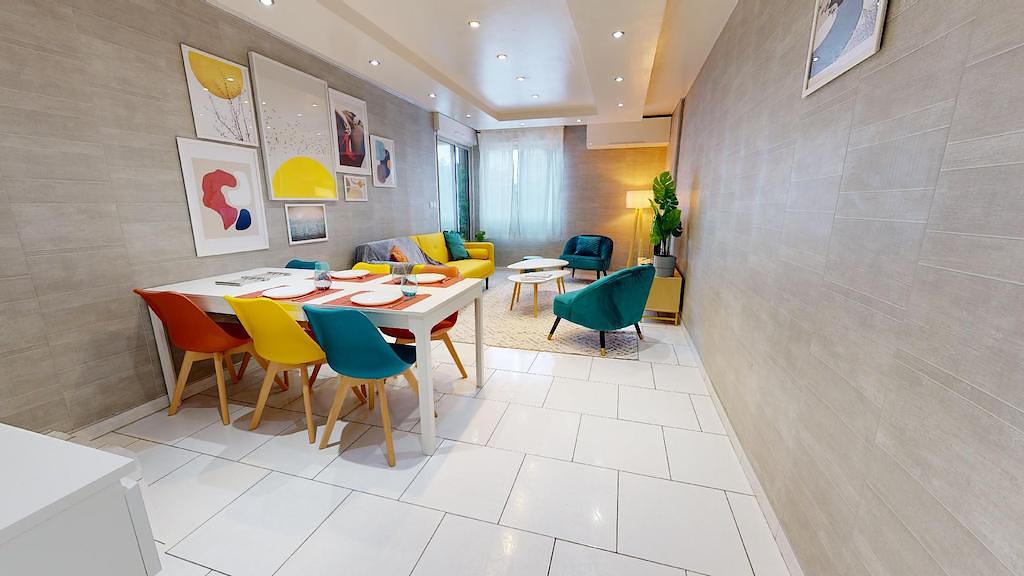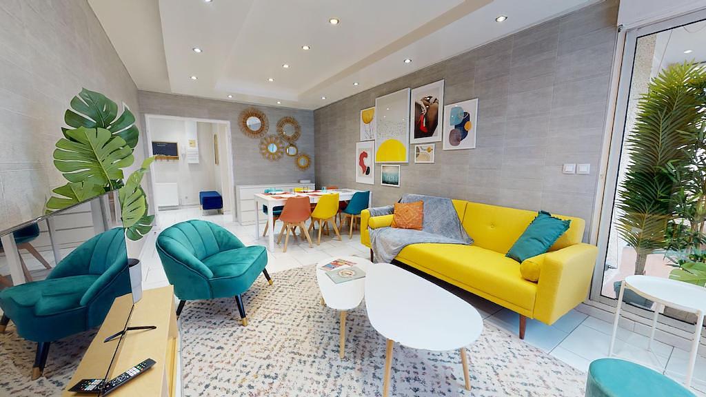 Le salon coloré et chaleureux offre un coin salle à manger avec un buffet, une table et six chaises, idéal pour partager des repas entre colocataires. Le coin salon est disposé avec un canapé, deux tables basses, deux fauteuils, un tabouret, un meuble TV et une télévision ainsi que plusieurs éléments de décoration.