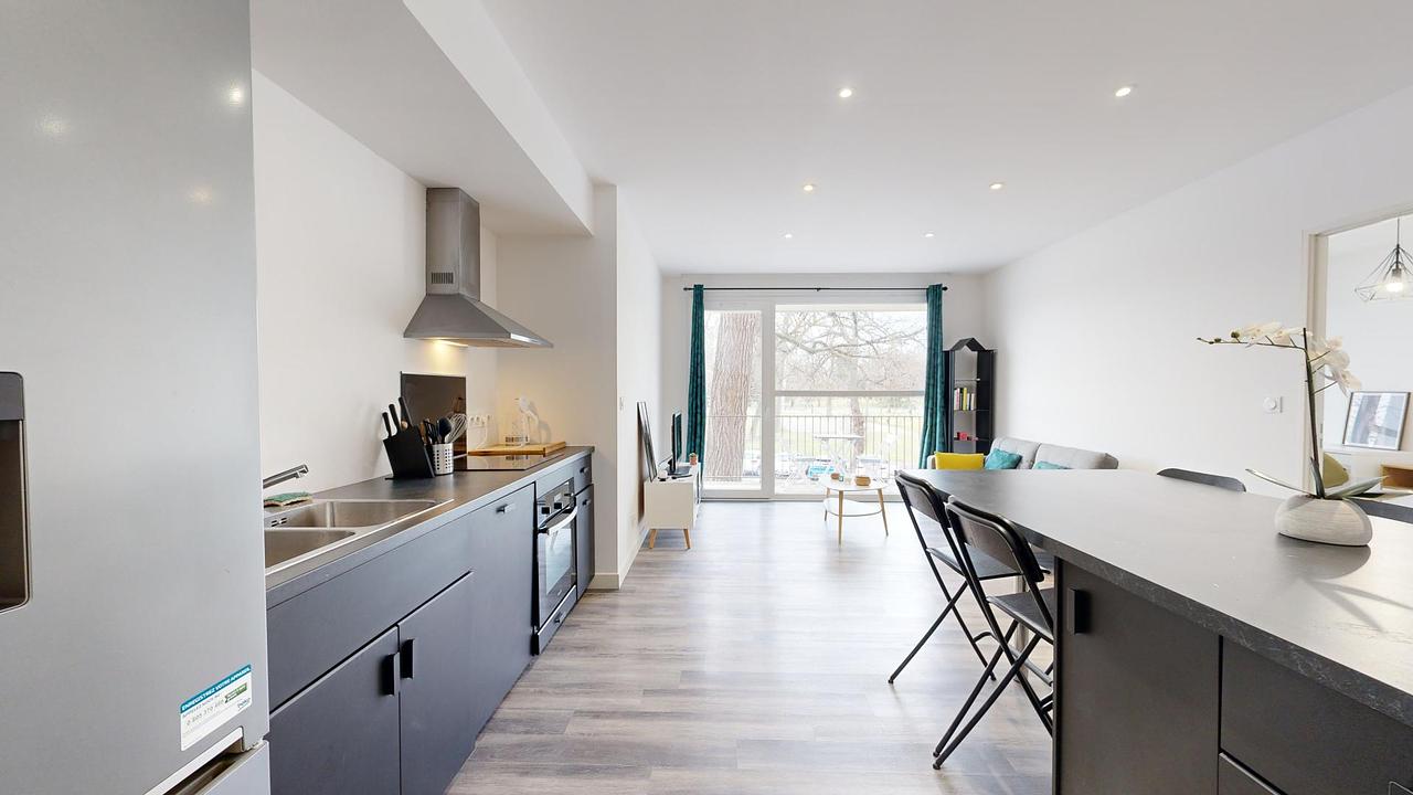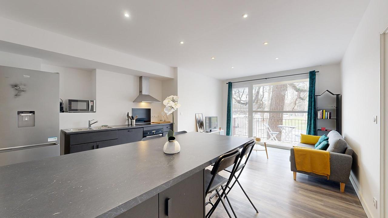 La colocation entièrement rénovée possède une belle pièce de vie avec coin salon et cuisine ouverte. Le séjour possède un canapé, table basse gigogne, TV et meuble TV ainsi qu'une belle table à manger effet marbre avec rangements. La cuisine est équipée d'un frigo américain, plaque de cuisson et hotte, four et microondes, ainsi que de nombreux rangements.