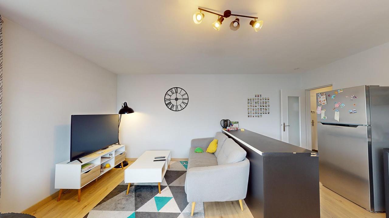 Un séjour lumineux, grâce à deux grandes fenêtres, avec un canapé, une table basse, un meuble Tv avec sa télévision et une table à manger avec ses quatre chaises.