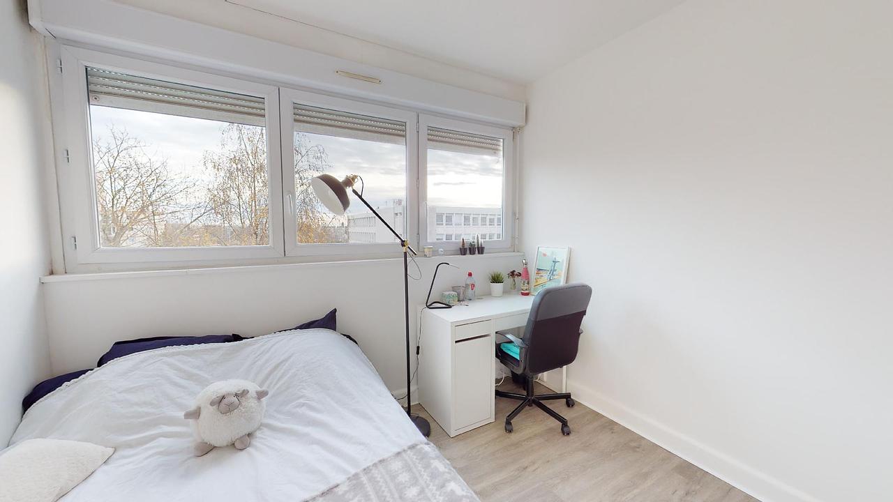 La chambre est lumineuse et meublée par un : un lit, un bureau ainsi qu'un placard de rangement