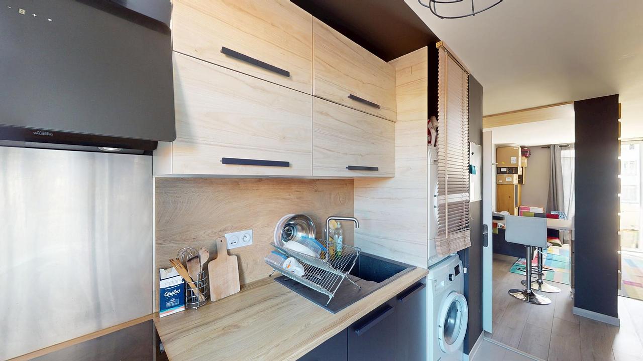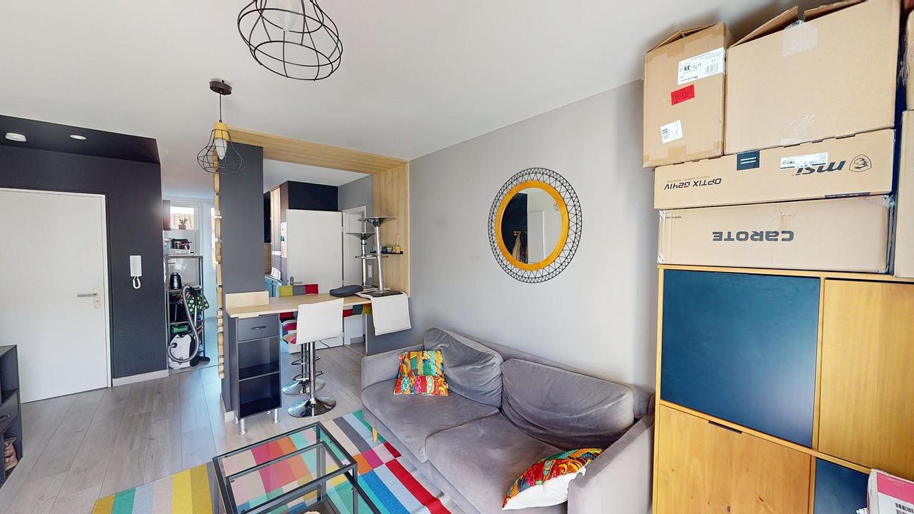 La pièce de vie est aménagée pour offrir un maximum de confort au quotidien. Elle comprend un coin canapé, une télévision, des placards de rangement ainsi qu’une table à manger avec des tabourets. Lumineux et convivial, le séjour s’ouvre sur un balcon, parfait pour profiter de l’extérieur.