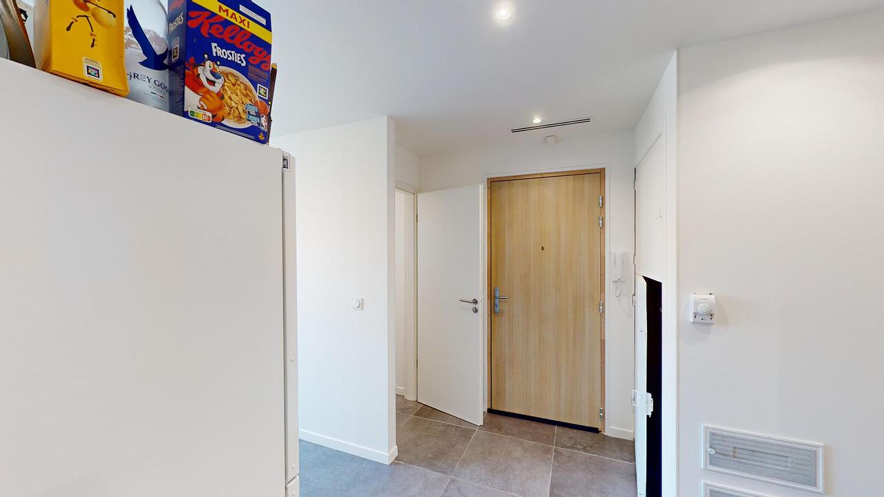 L'appartement s'ouvre sur une entrée avec rangements desservant un séjour avec cuisine ouverte. Celui-ci dispose d'un fauteuil, d'un meuble TV avec TV, une table haute avec 4 chaises.