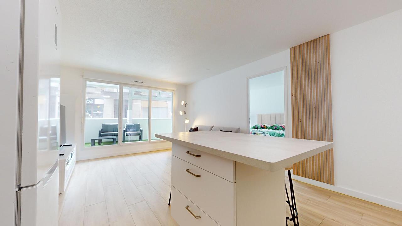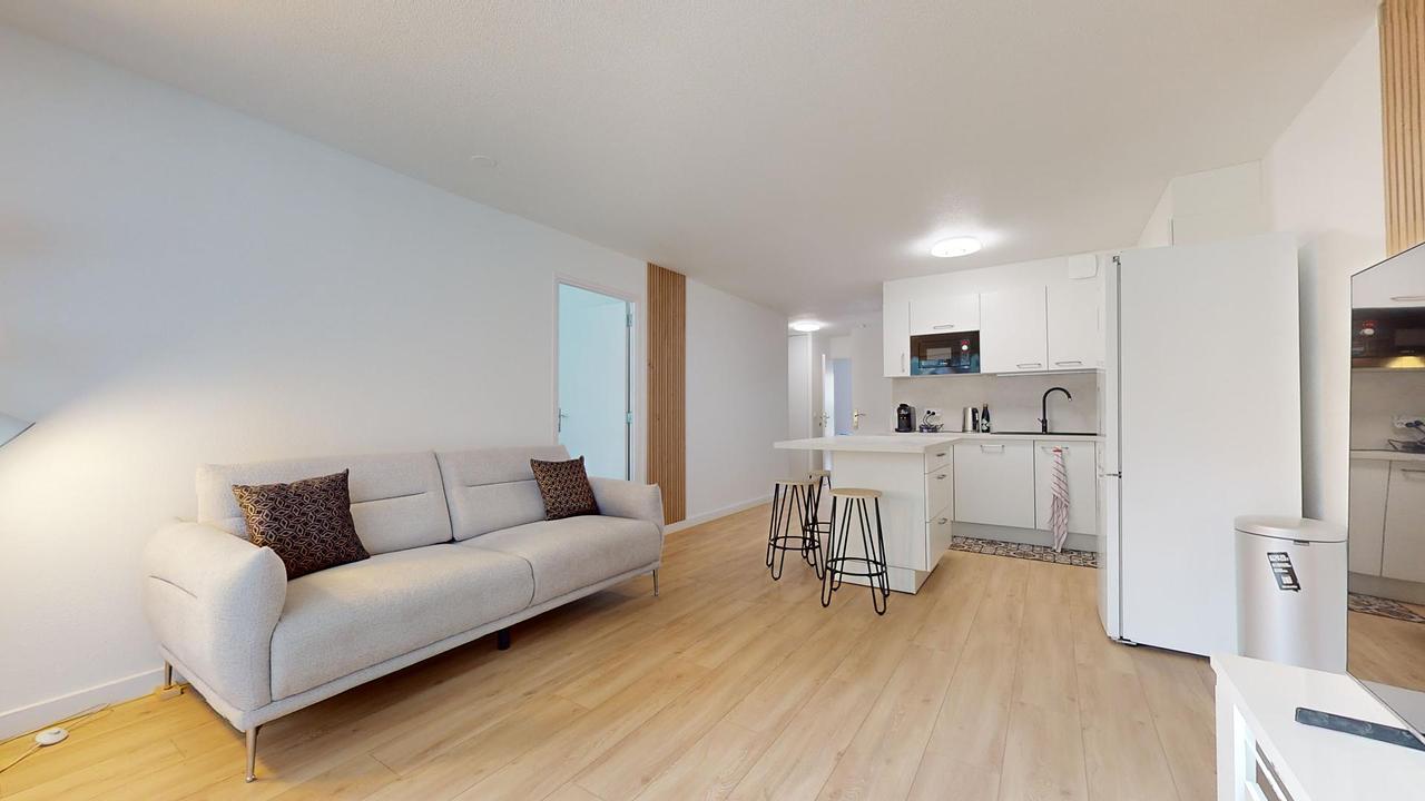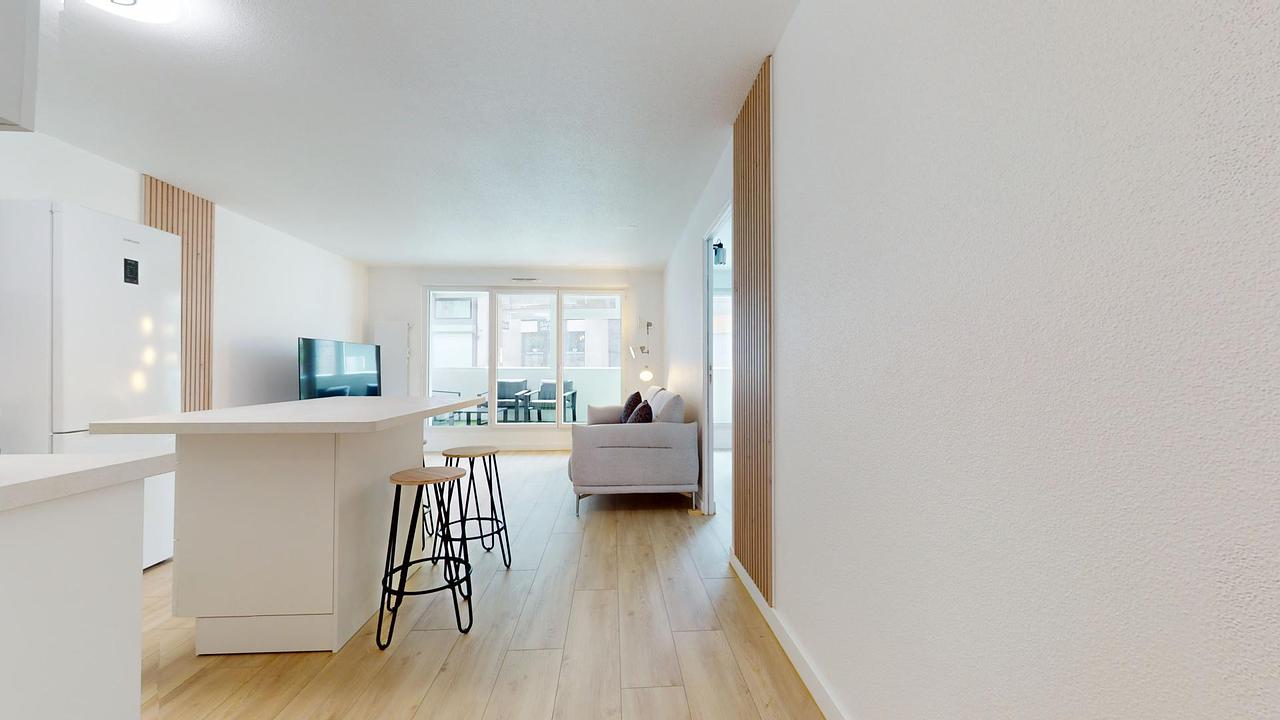 L'appartement s'ouvre sur une entrée avec rangements desservant un spacieux séjour avec cuisine ouverte. Celui-ci dispose d'un canapé et d'un meuble TV avec TV