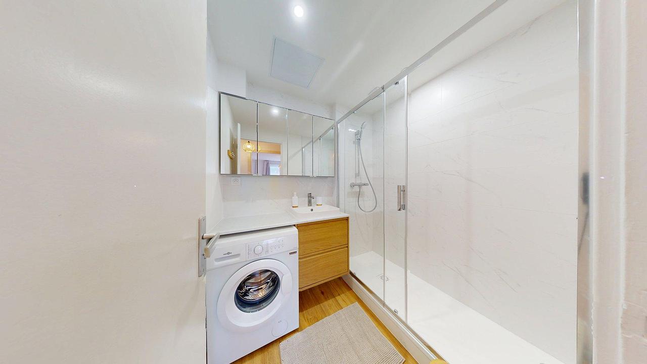 L'organisation des espaces sanitaires a été optimisée pour garantir la tranquillité de chacun. La colocation dispose de deux salles de bain modernes : la première est privative et réservée à l'une des chambres pour une autonomie totale, tandis que la seconde, équipée d'une grande douche à l'italienne et d'un meuble vasque, est partagée entre les trois autres colocataires.