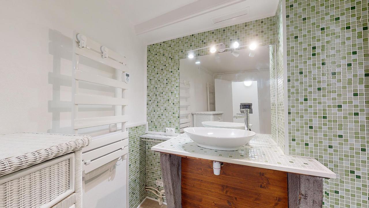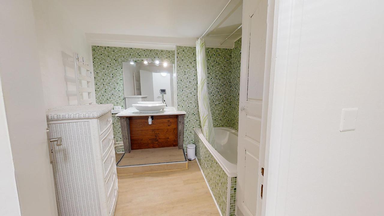 au 2e étage : une mezzanine avec deux fauteuils, deux chambres, une buanderie (avec lave-linge séchant, un évier, et des rangements), une salle de bain (avec douche et baignoire) et un toilette séparé