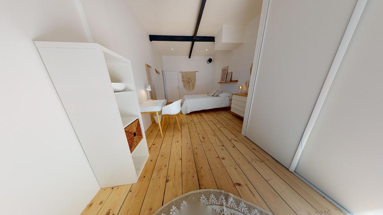 La chambre 9 est au fond du couloir du premier étage, elle est meublée d'un lit simple, d'une grande penderie et d'un bureau avec chaise. Il y a aussi un accès au deuxième étage privatif avec un salon dont seul la chambre 9 a accès La chambre a été redécorée avec goût et modernité.