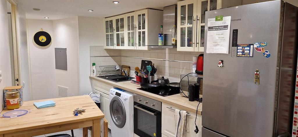 Les parties communes comprennent une cuisine entièrement équipée : frigo, micro-ondes, four, machine à laver séchante, table à manger, plaques de cuisson, rangements, etc.