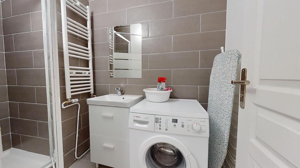 La salle de bain avec toilettes séparées se compose d'une douche, un meuble vasque avec un miroir et une machine à laver.