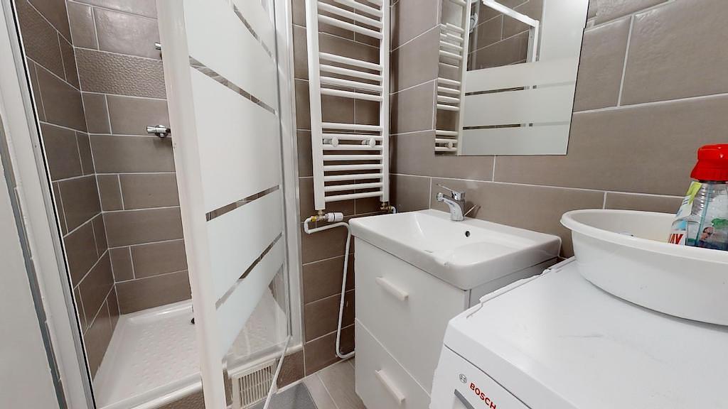 Cette colocation s'ouvre sur un grand hall et une pièce à vivre composé d'un canapé, un mange debout avec trois tabourets. La cuisine est équipée d'un four et d'un micro-ondes, un réfrigérateur avec un congélateur, un évier et des plaques à induction avec une hotte, un fer à repasser et un aspirateur sont également à disposition.